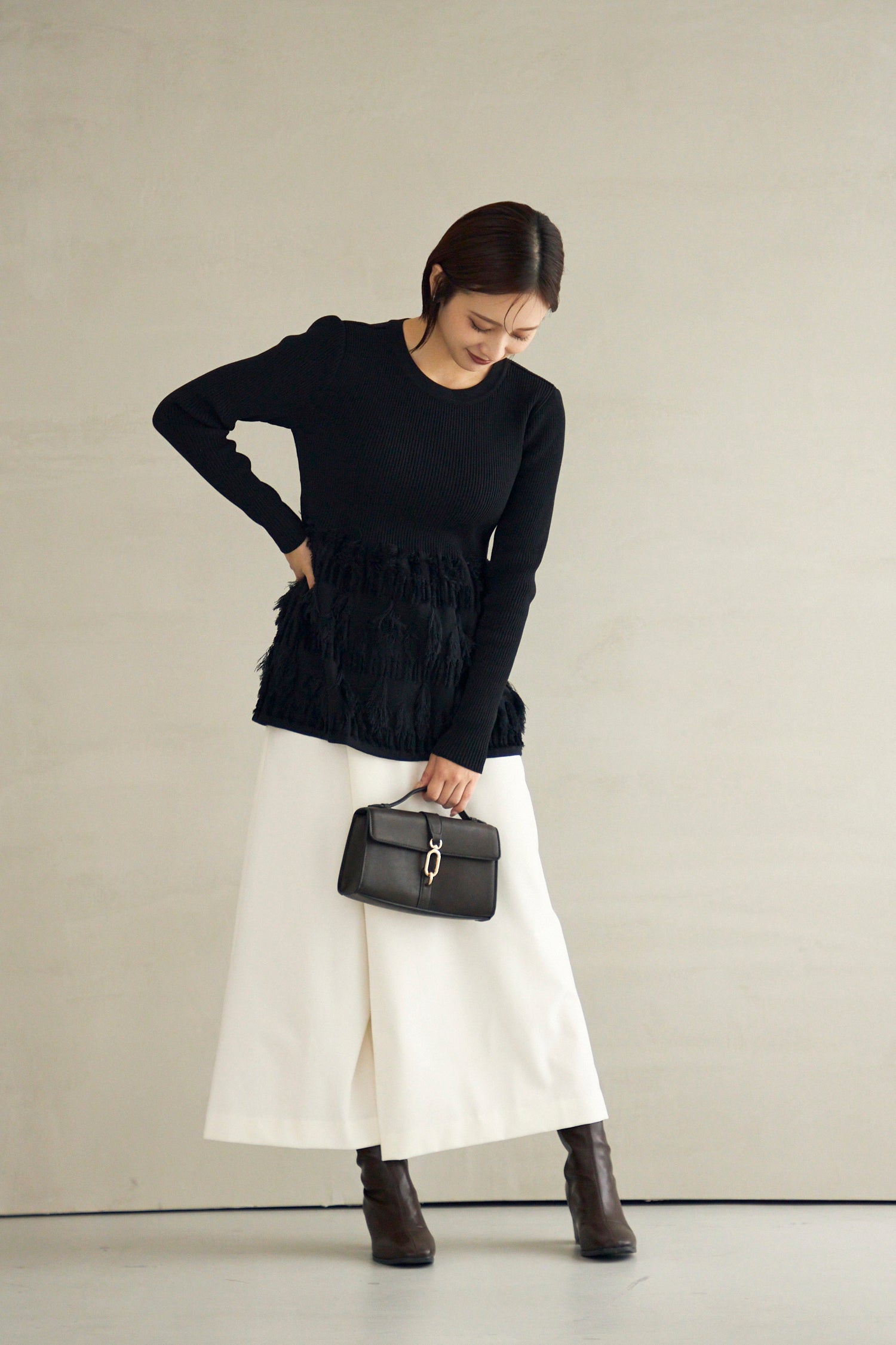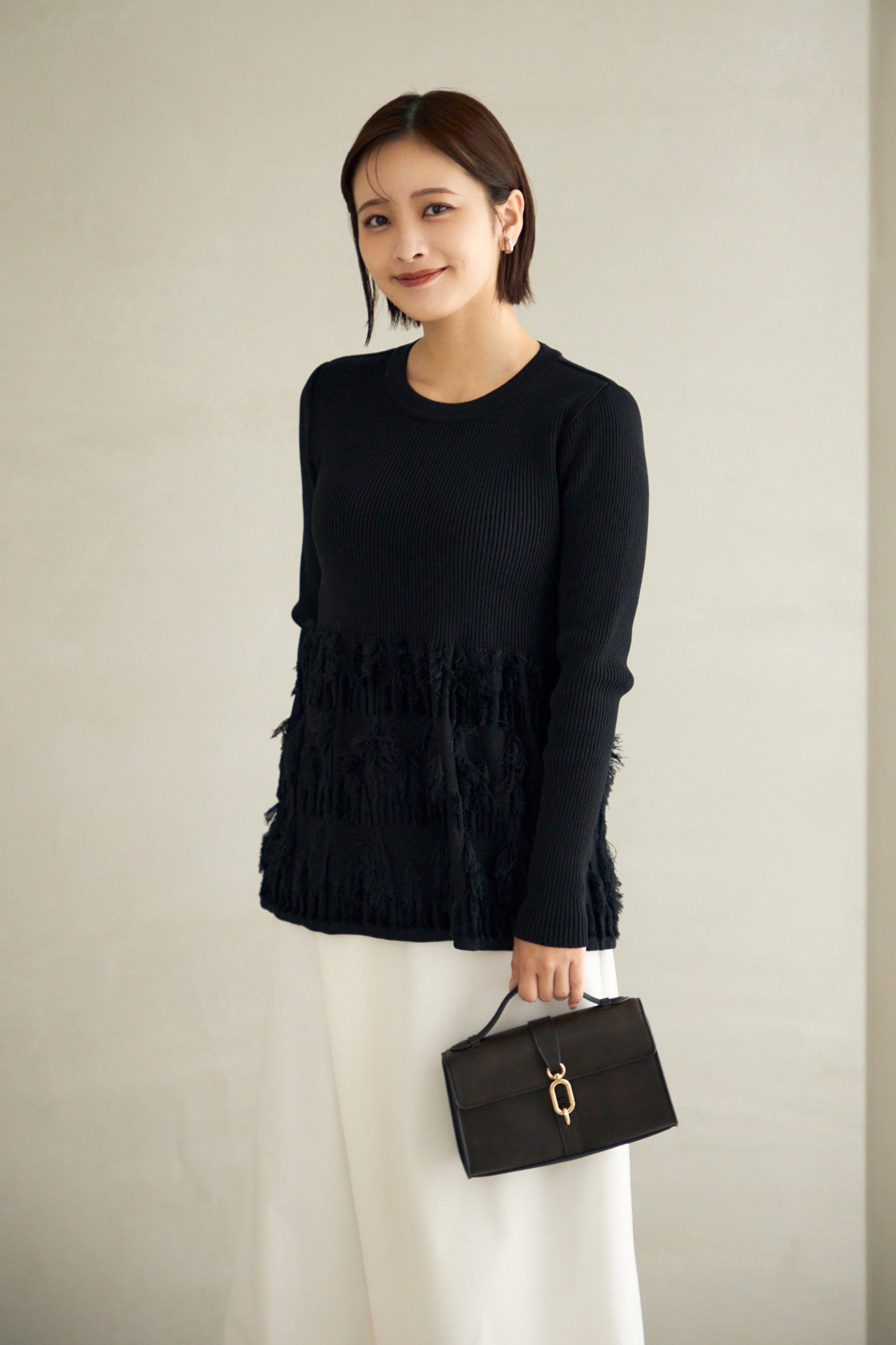 河出奈都美157cm カジュアルをベースに可愛さをプラスしたコーデが好きです。 Styling Items Fringe rib knit tops(Black) ¥28,600 The icon pants(Ivory) ¥28,600