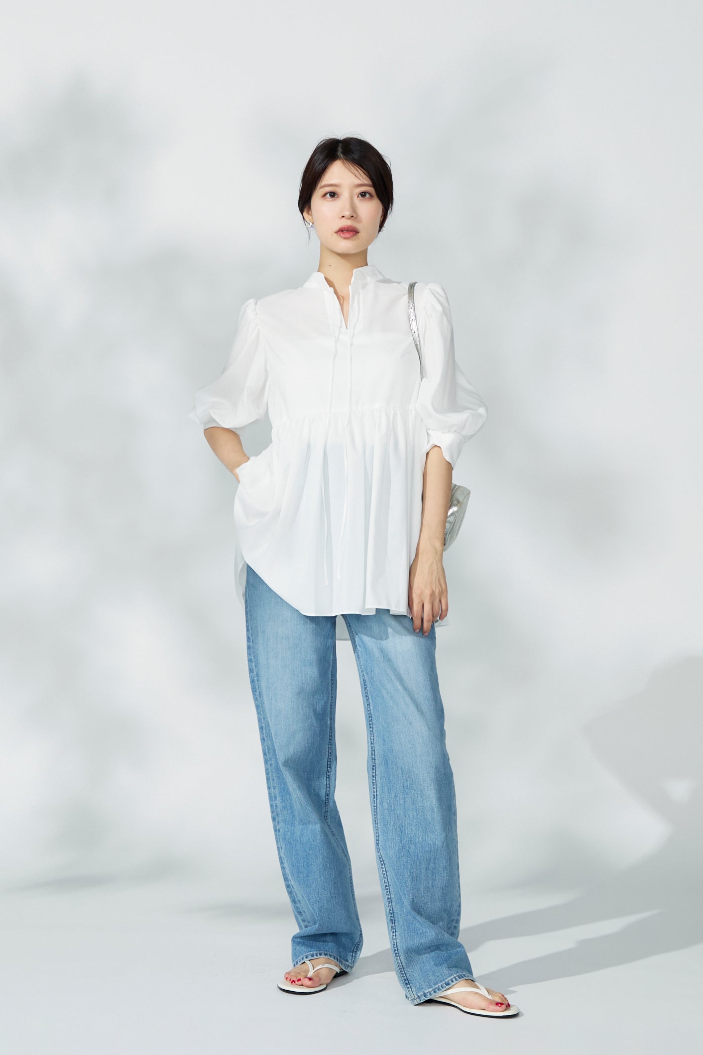 穿き込んだような古着風の表情と、YANUK らしい上品さを兼ね備えた加工感。淡色ジーンズはカジュアルな印象になりがちですが、スリの入れ方などにこだわることでスタイリッシュさをプラス。