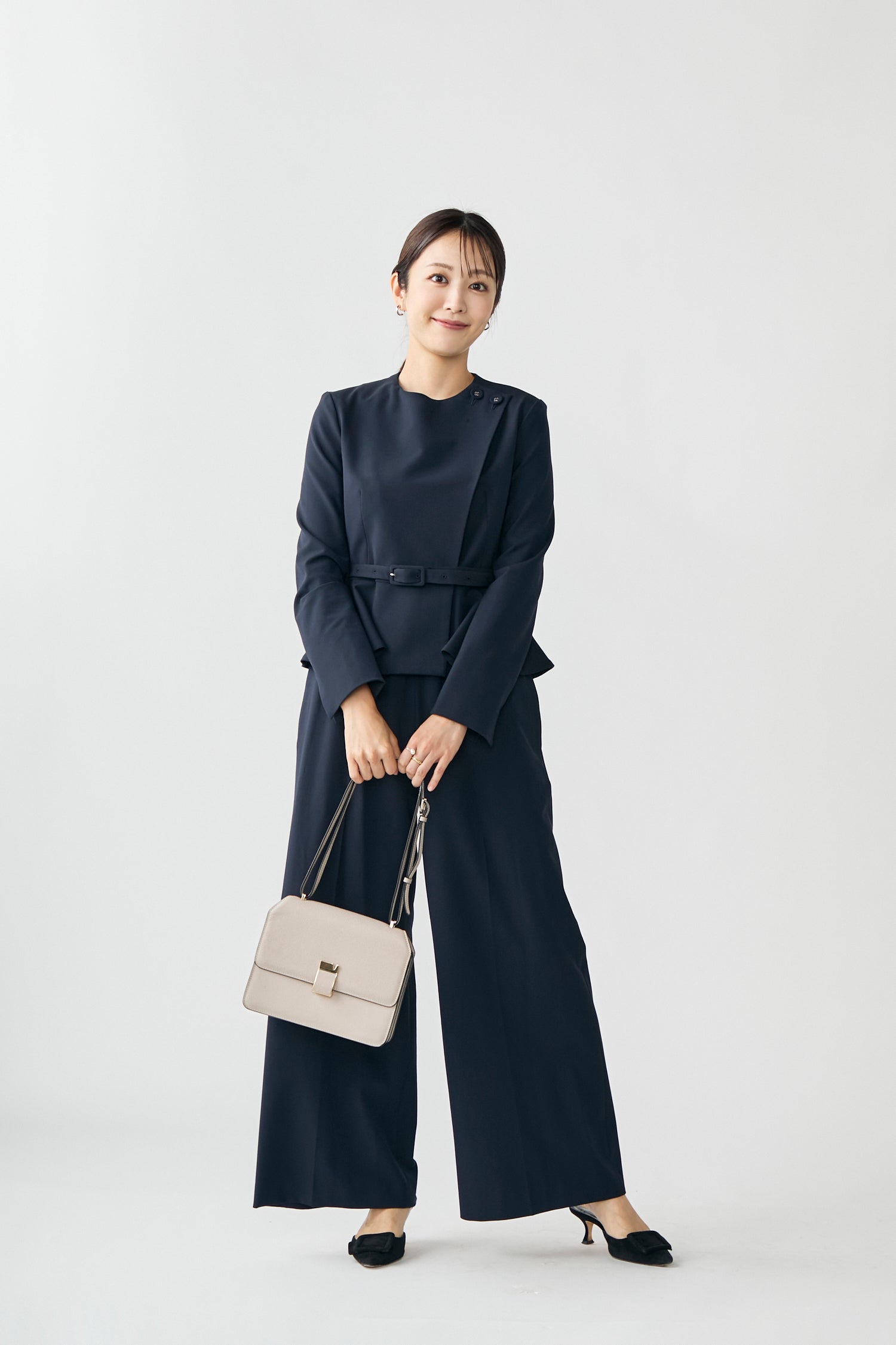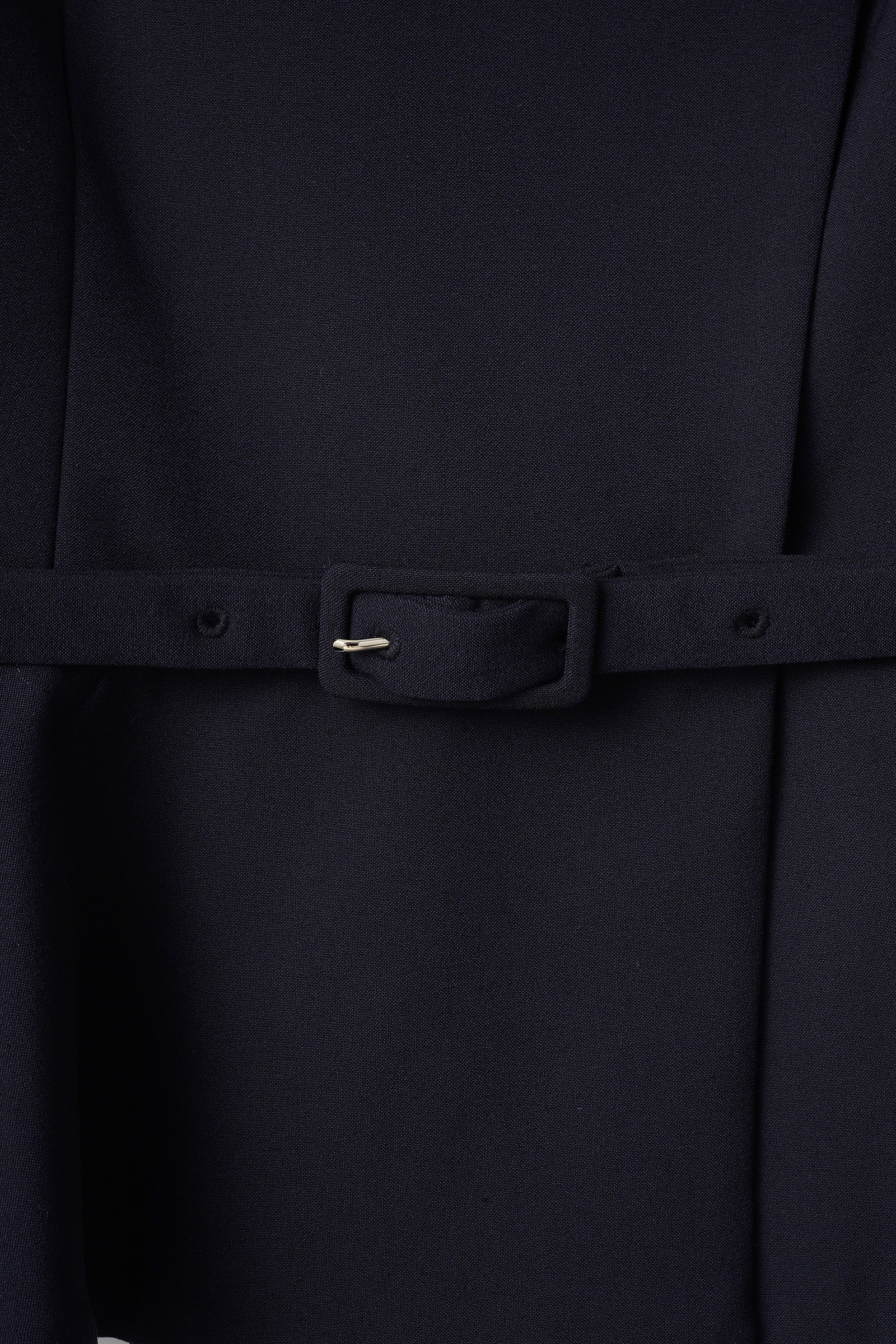 ジャストウエストについた共布ベルトでメリハリのあるシルエットに仕上げています。