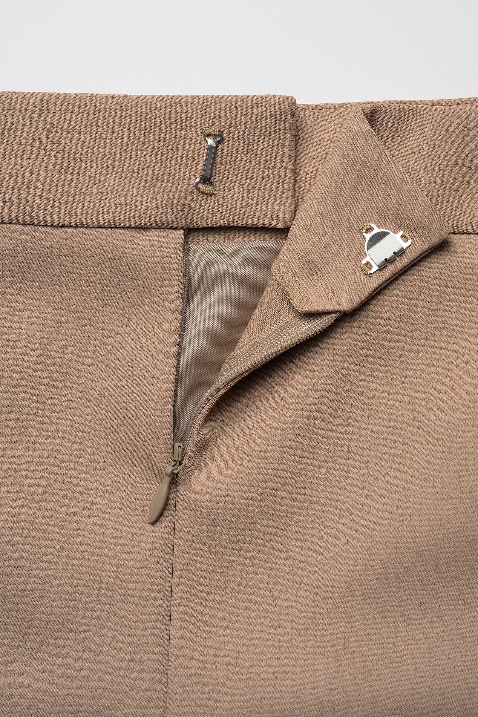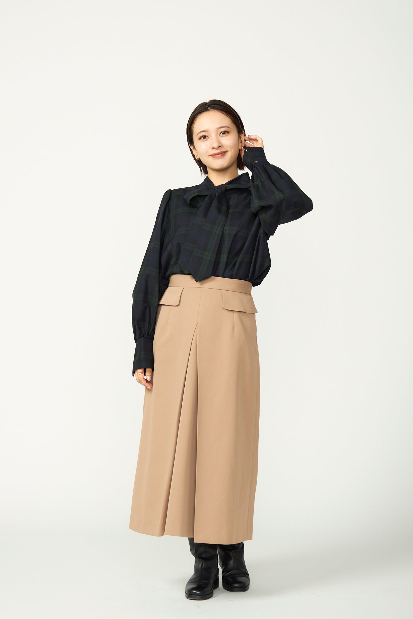 フロントにあしらったフラップポケットと、ベルトラインから斜めに施されたカットワークがアクセントのミディスカート。