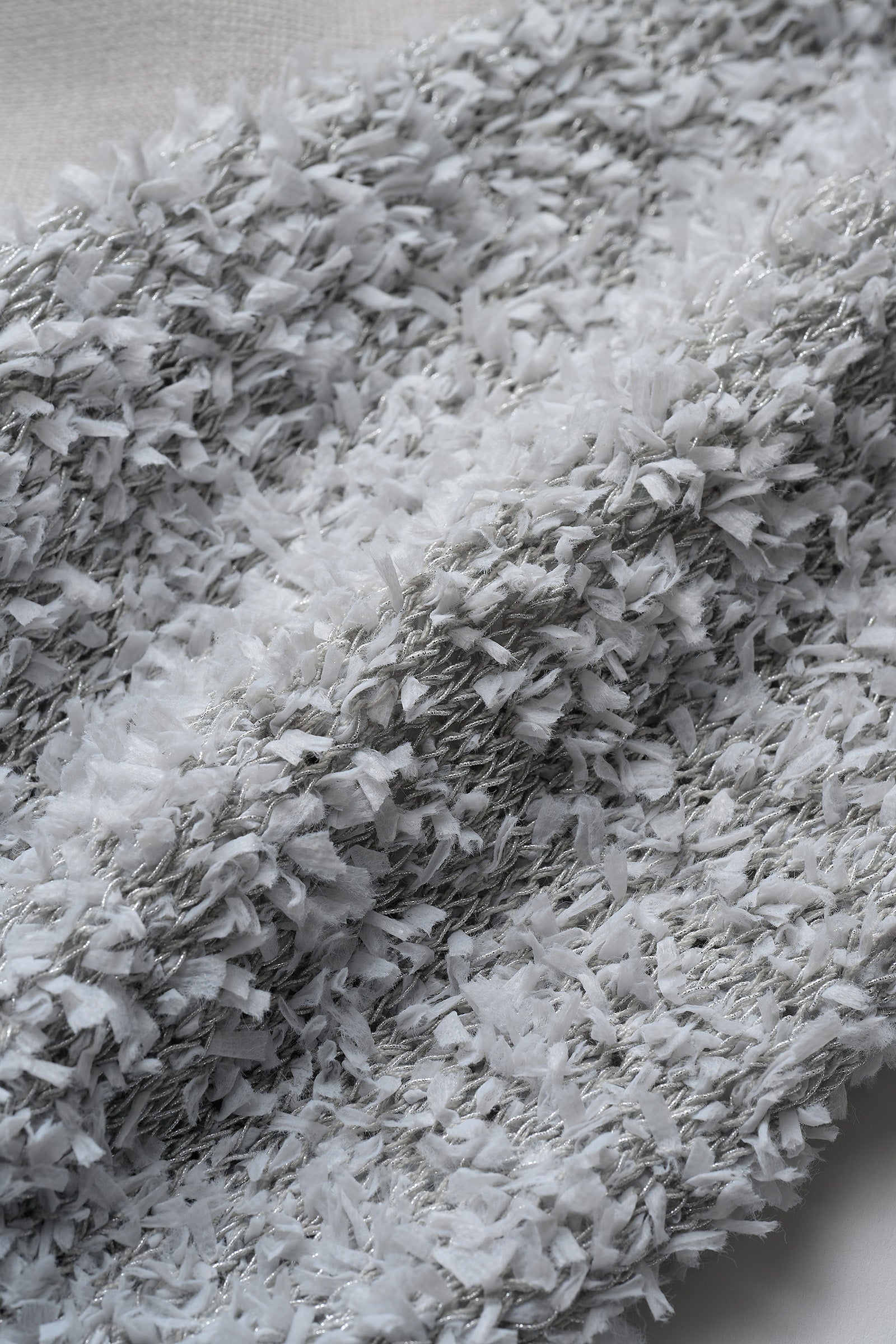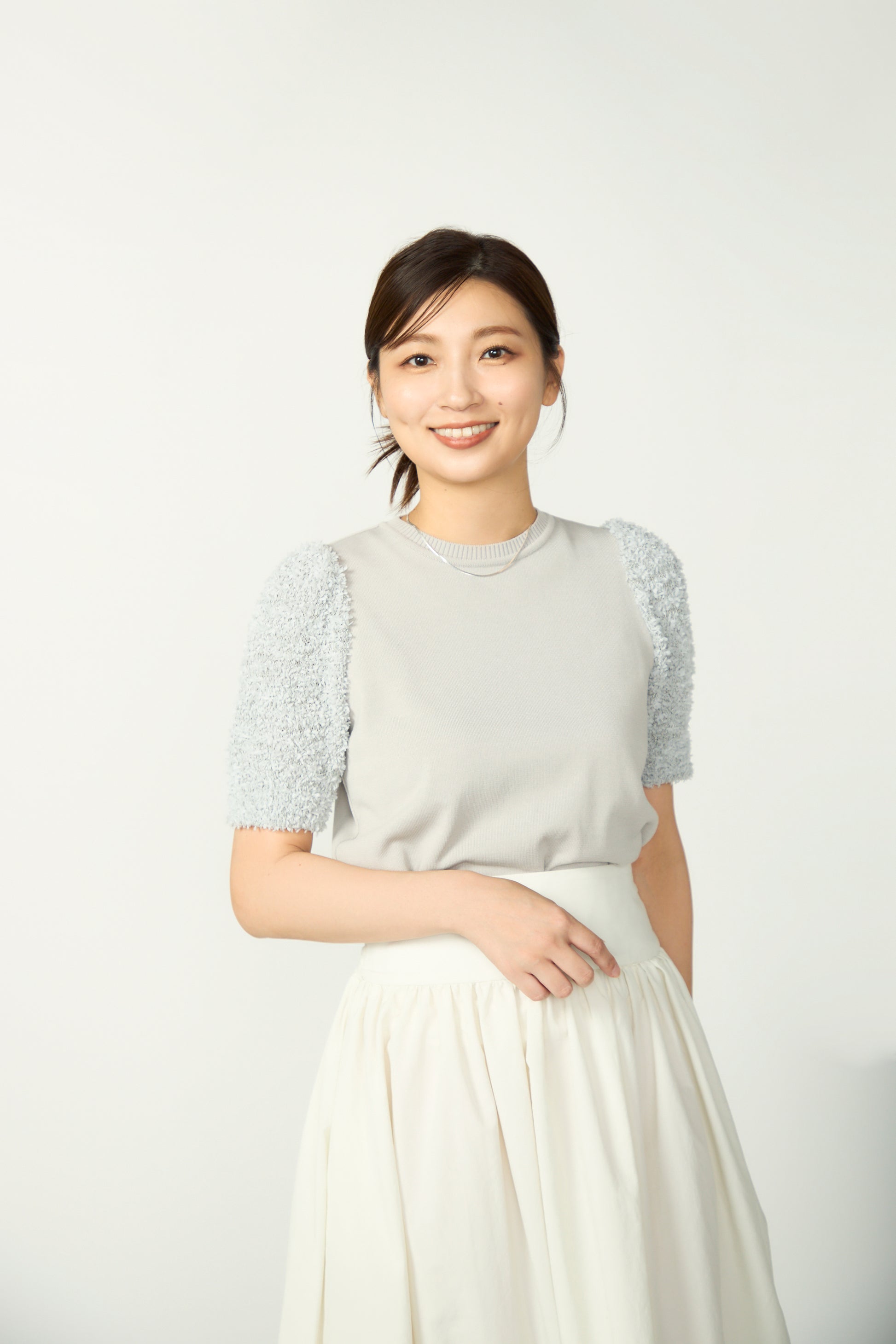 袖部分に雪のような表情の糸を使用した、異素材ドッキングの半袖ニット。