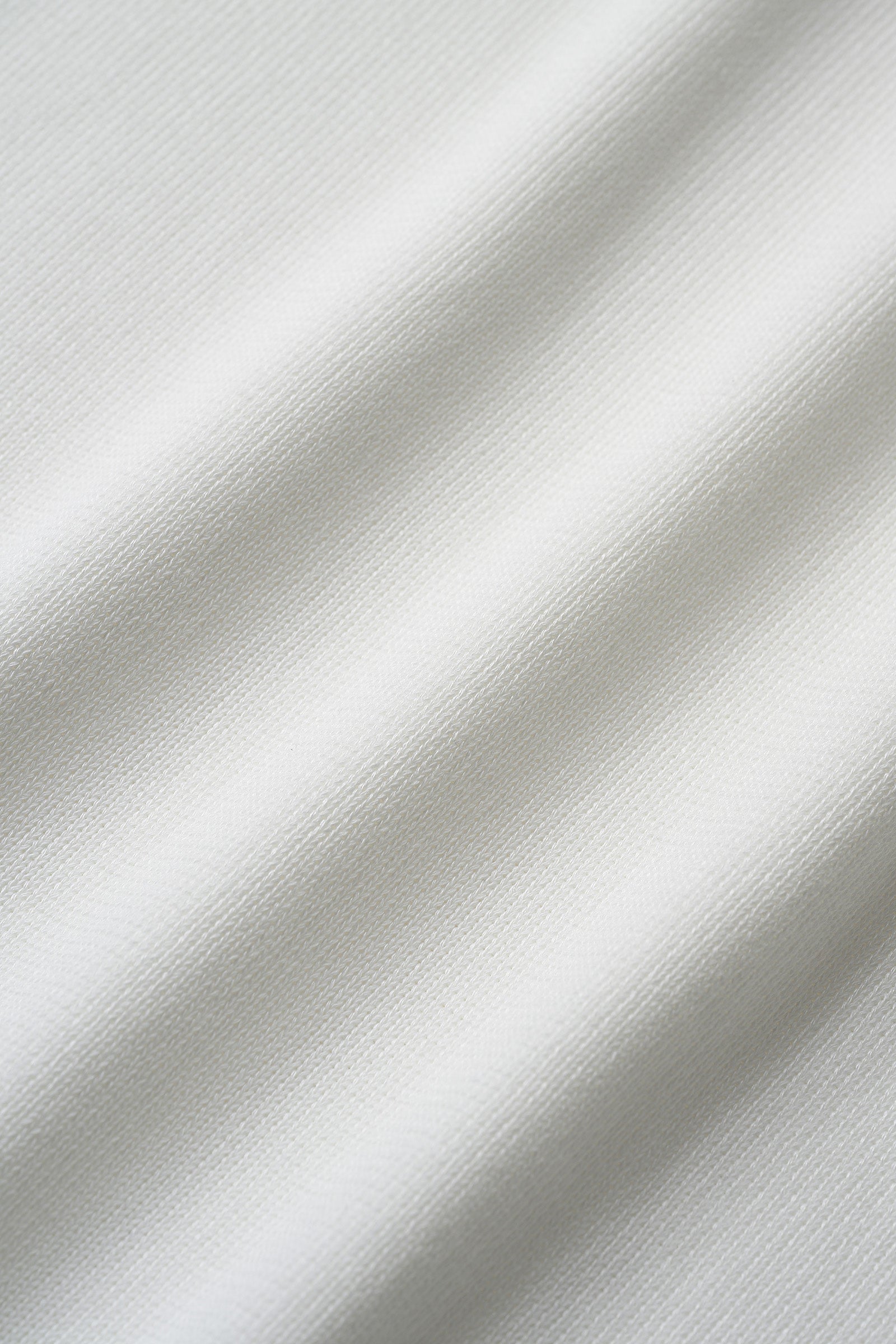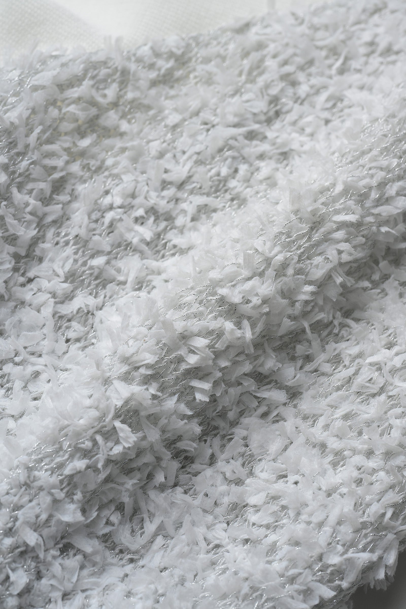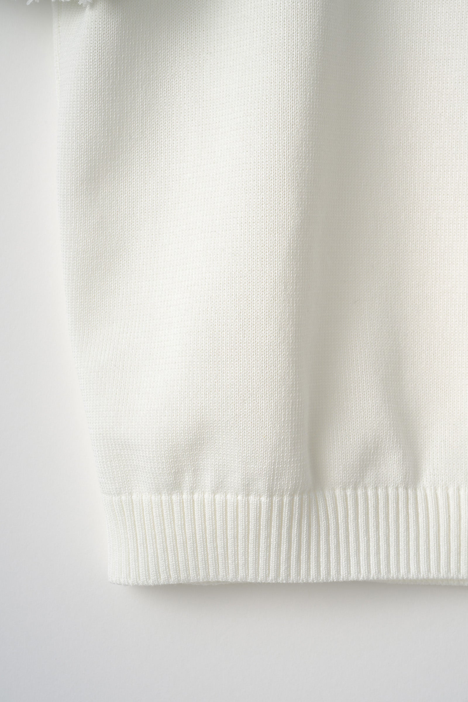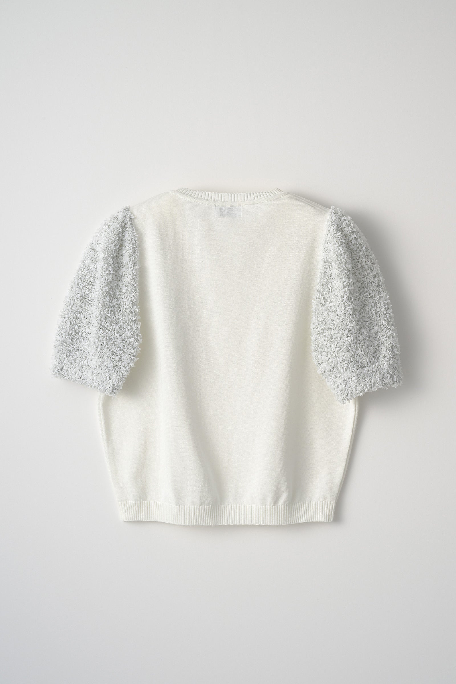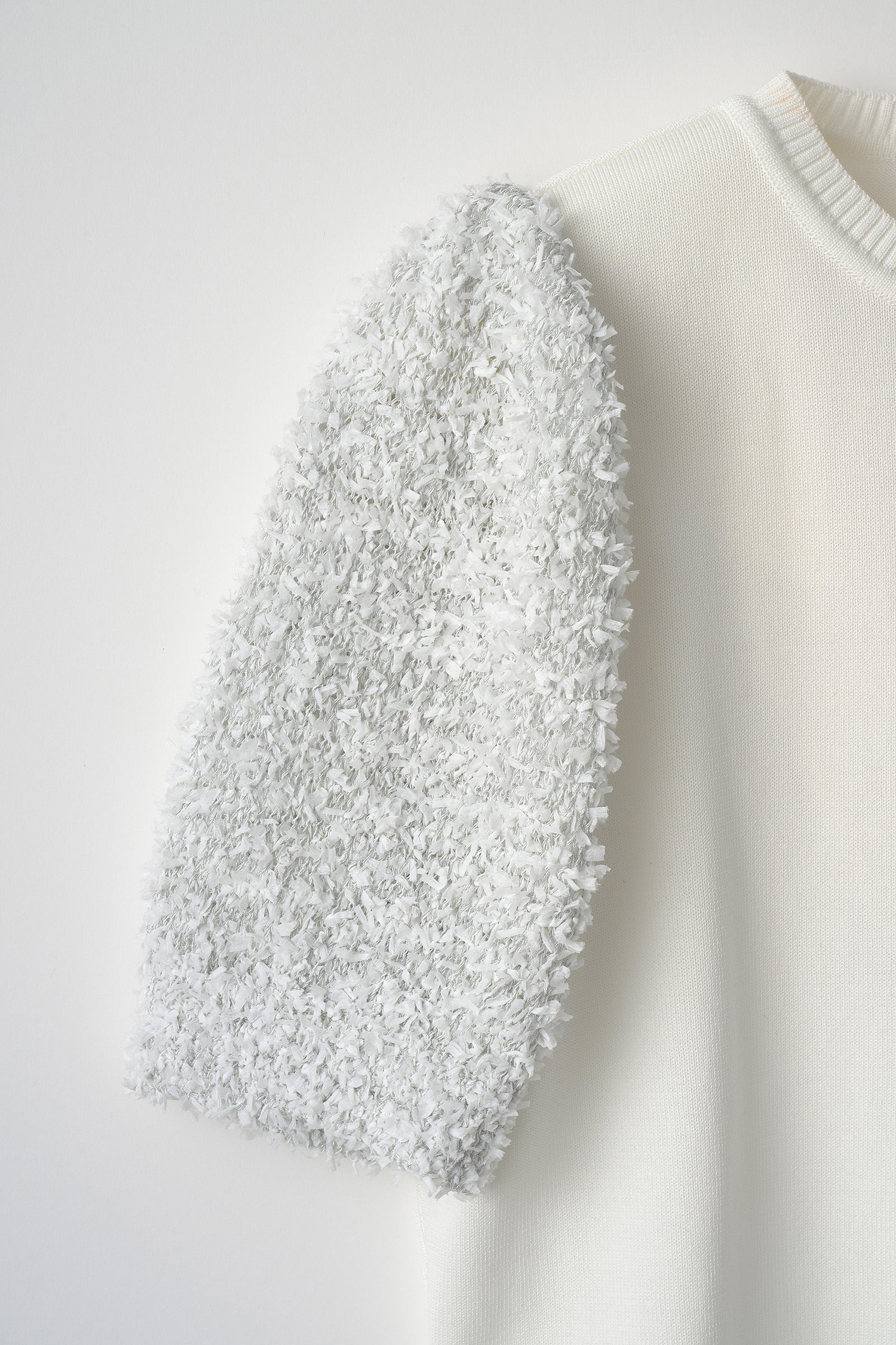袖部分に雪のような表情の糸を使用した、異素材ドッキングの半袖ニット。