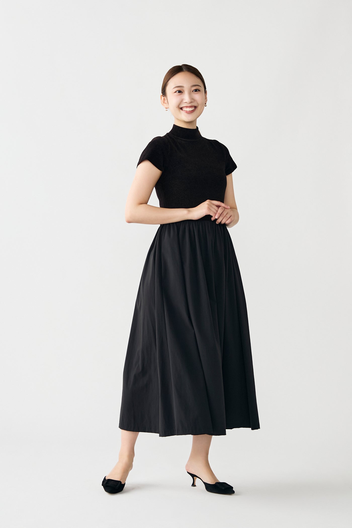 スカートは程よいフレアシルエットで、動きに合わせてきれいに広がります。