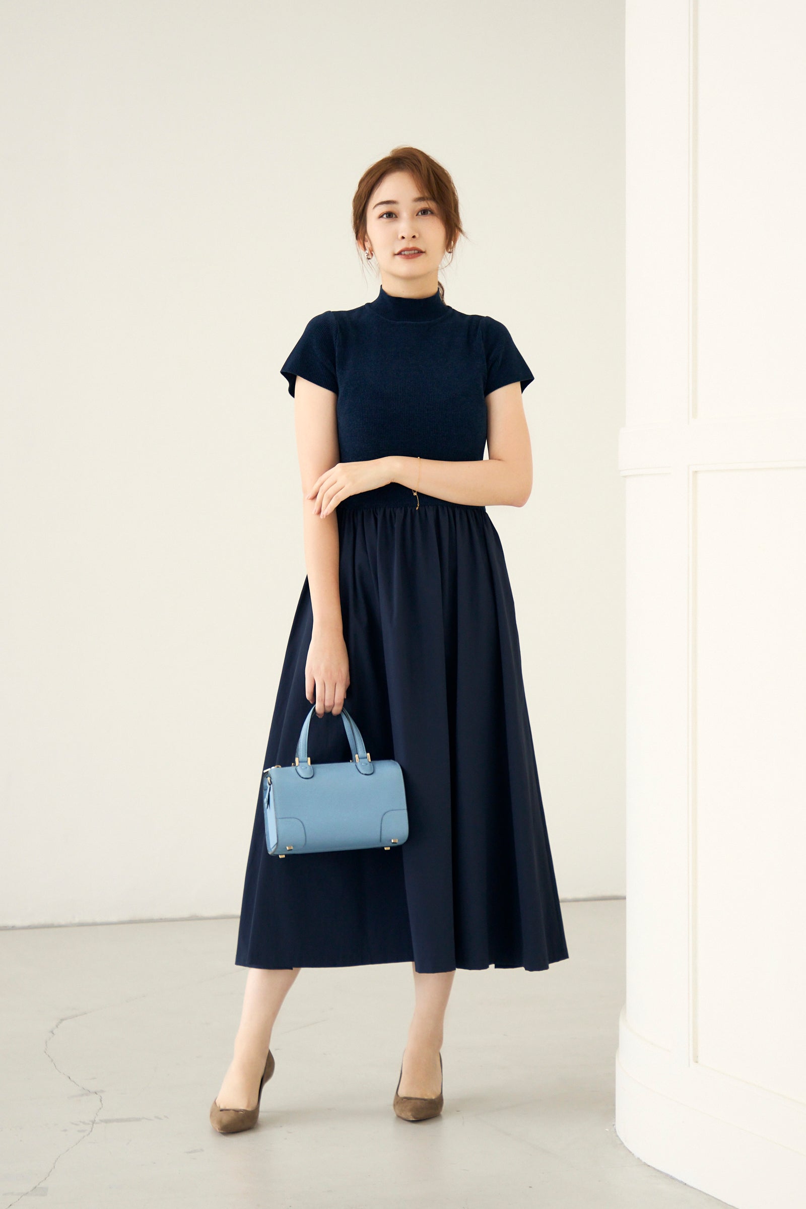 首元はハイネック、袖はキャップスリーブで、上品さと抜け感を兼ね備えたバランスの良い一着です。
