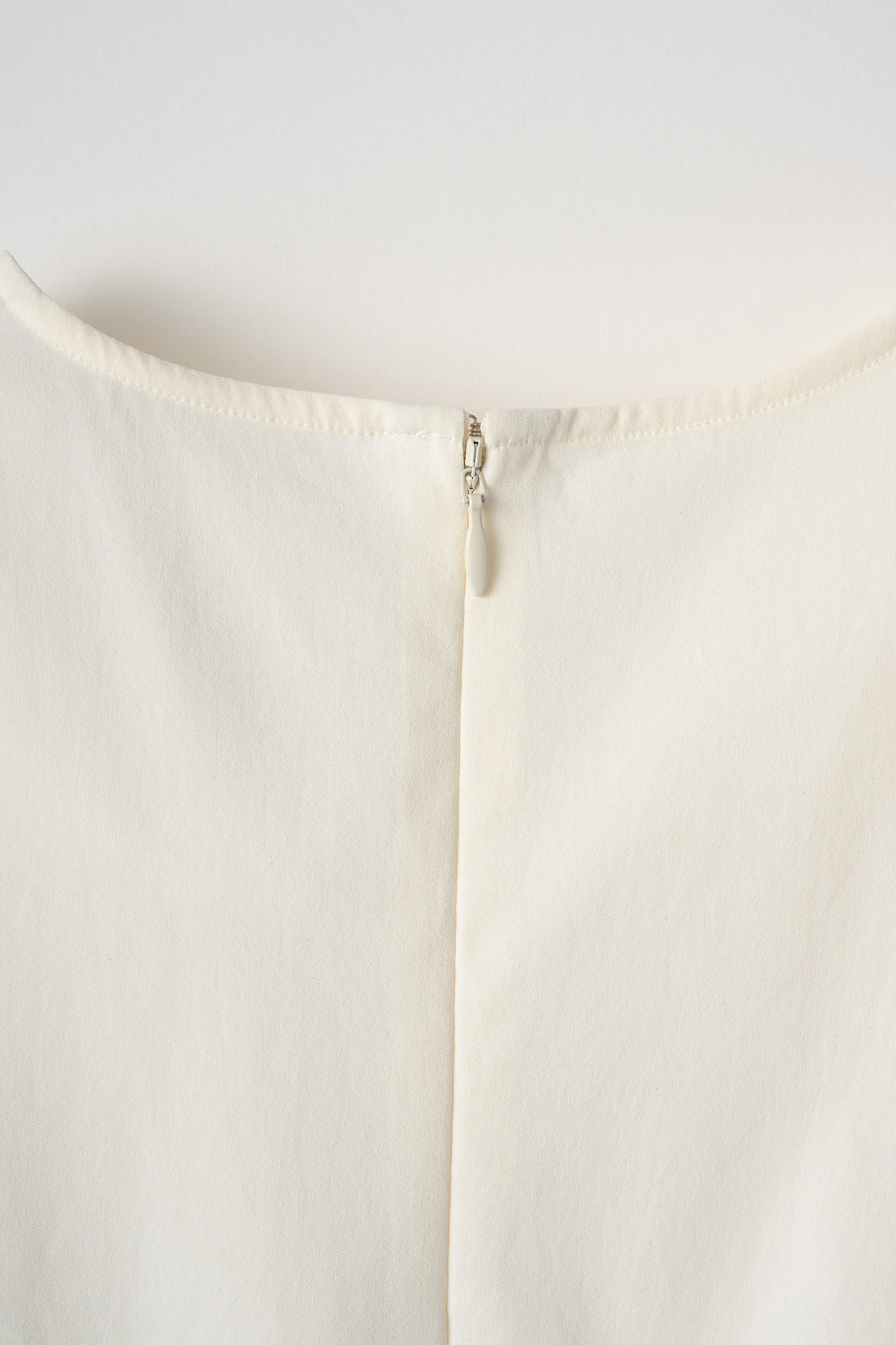 顔まわりをすっきり見せてくれる深めのVネックに加え、袖口にはギャザーを入れたボリュームスリーブを採用。