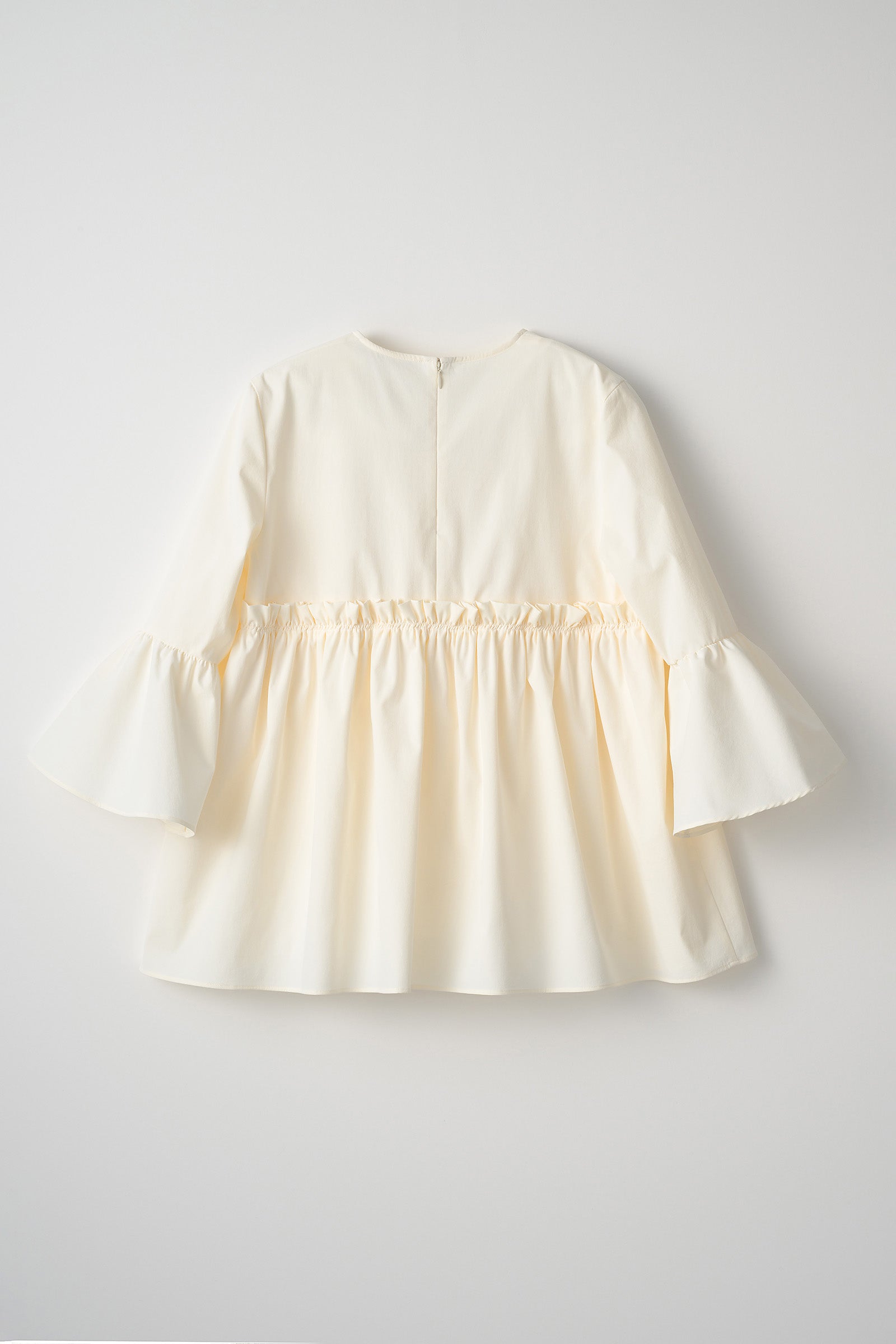 胸下にギャザーを寄せた切り替えから、ふわりと広がるフレアラインが特徴のブラウス。