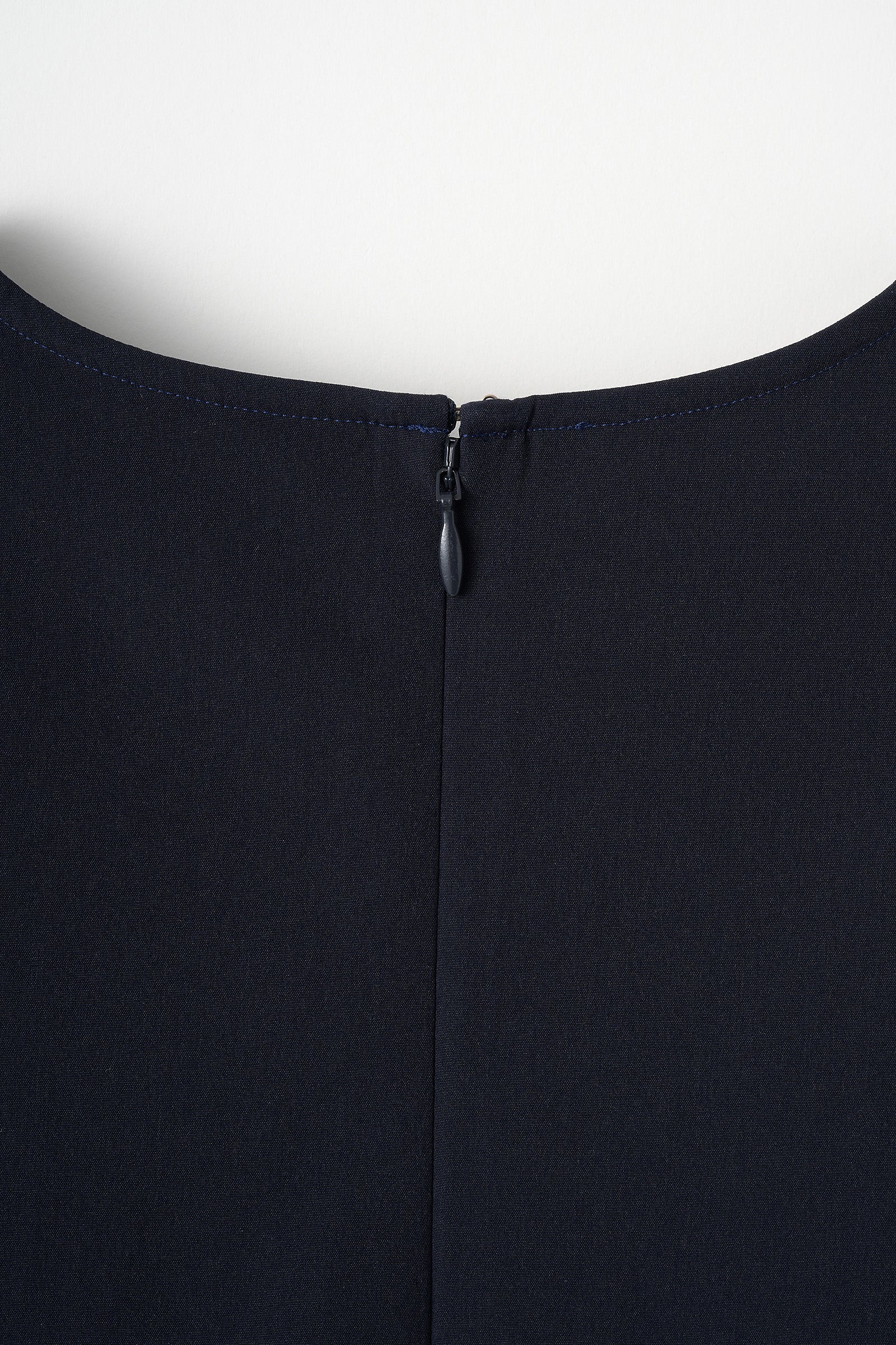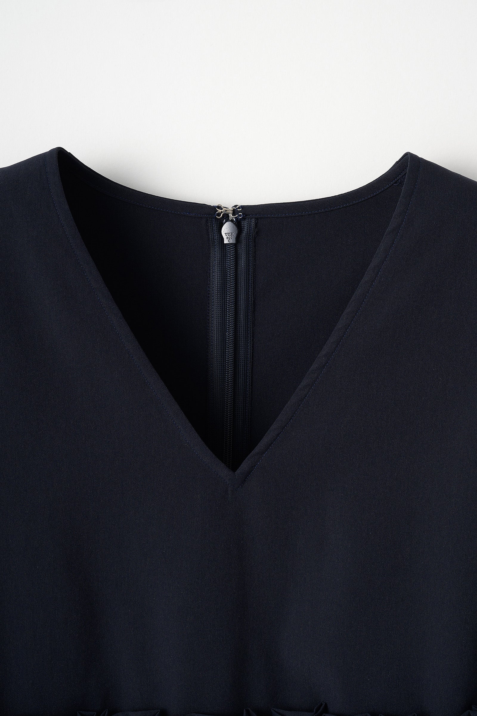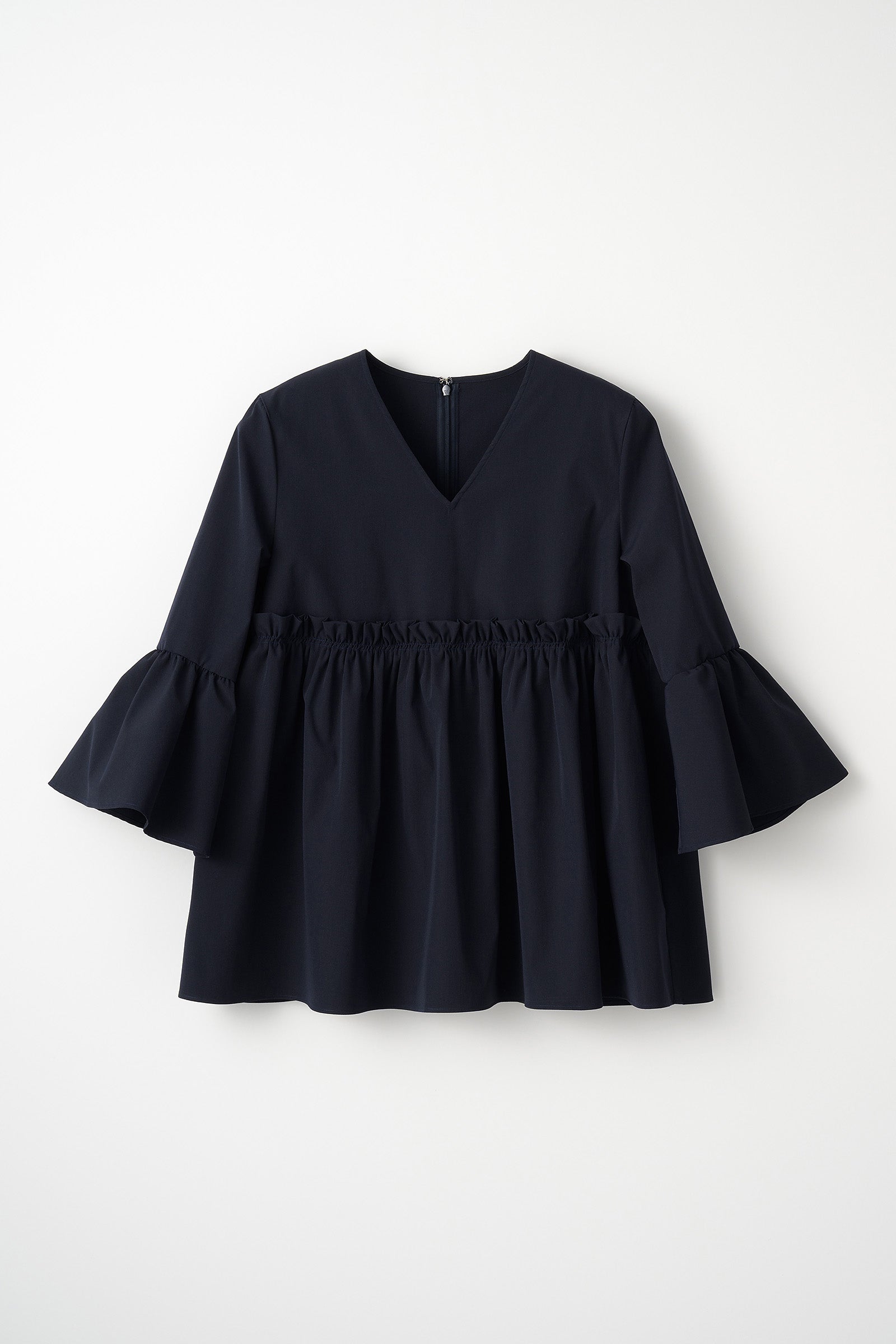 顔まわりをすっきり見せてくれる深めのVネックに加え、袖口にはギャザーを入れたボリュームスリーブを採用。