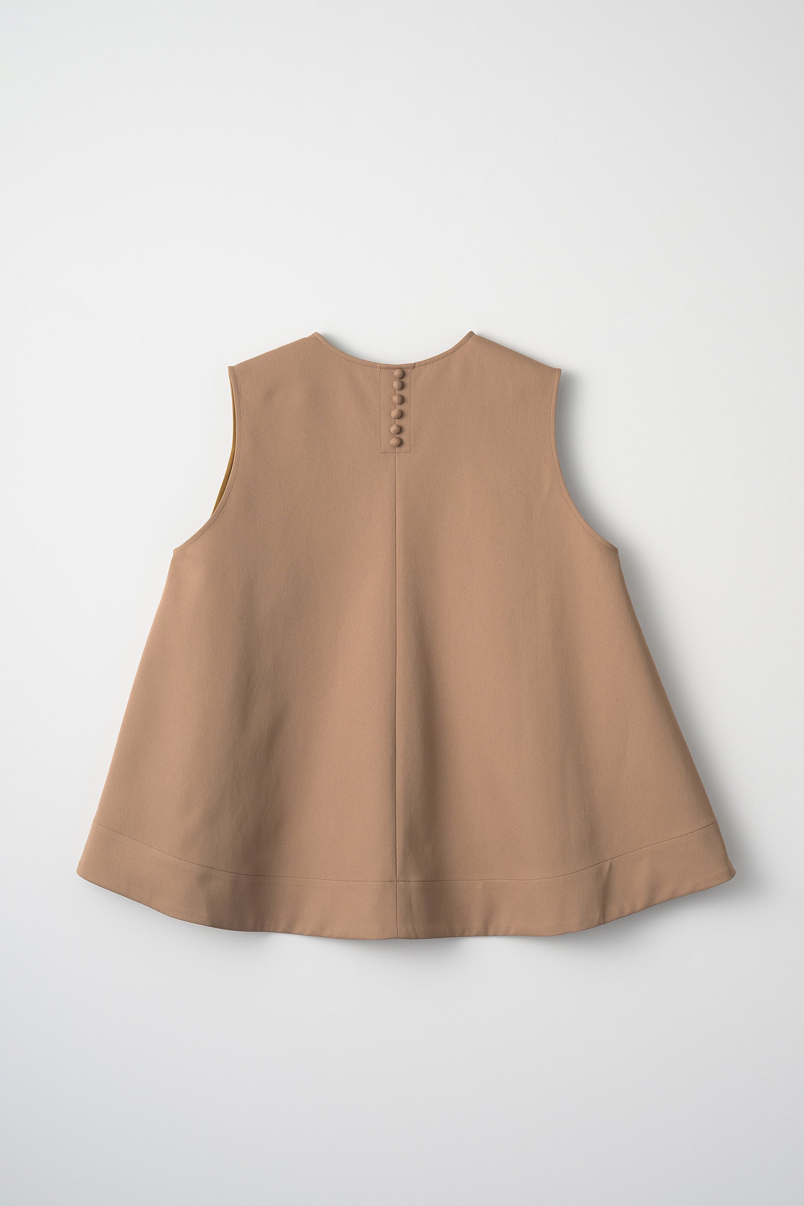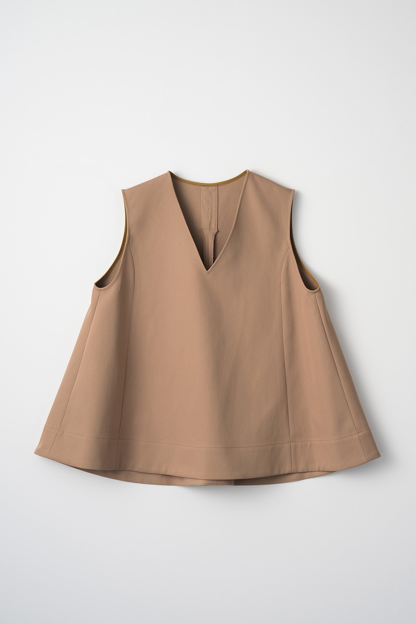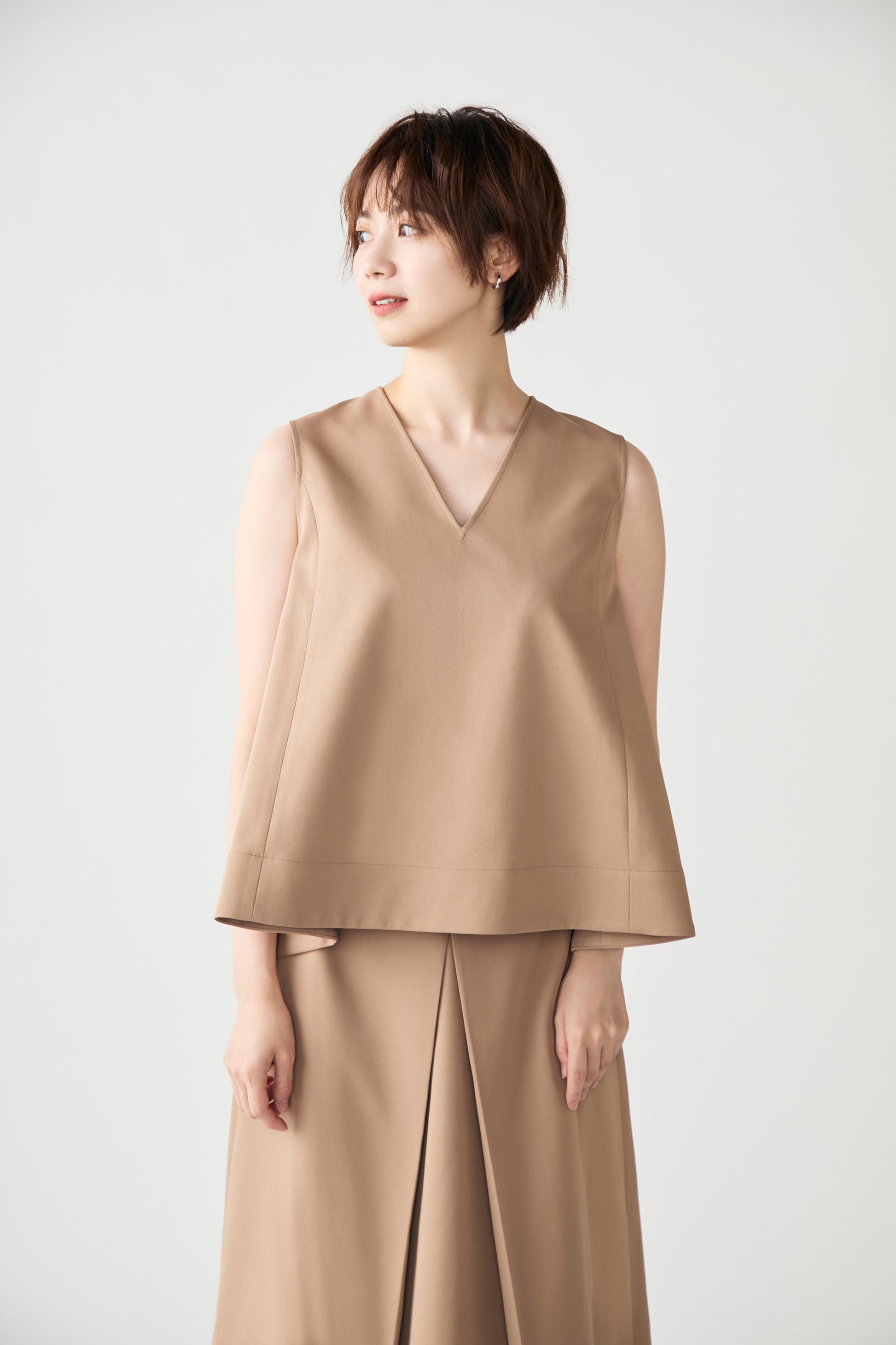 胸元から立体的に広がるフレアシルエットが印象的なノースリーブトップス。