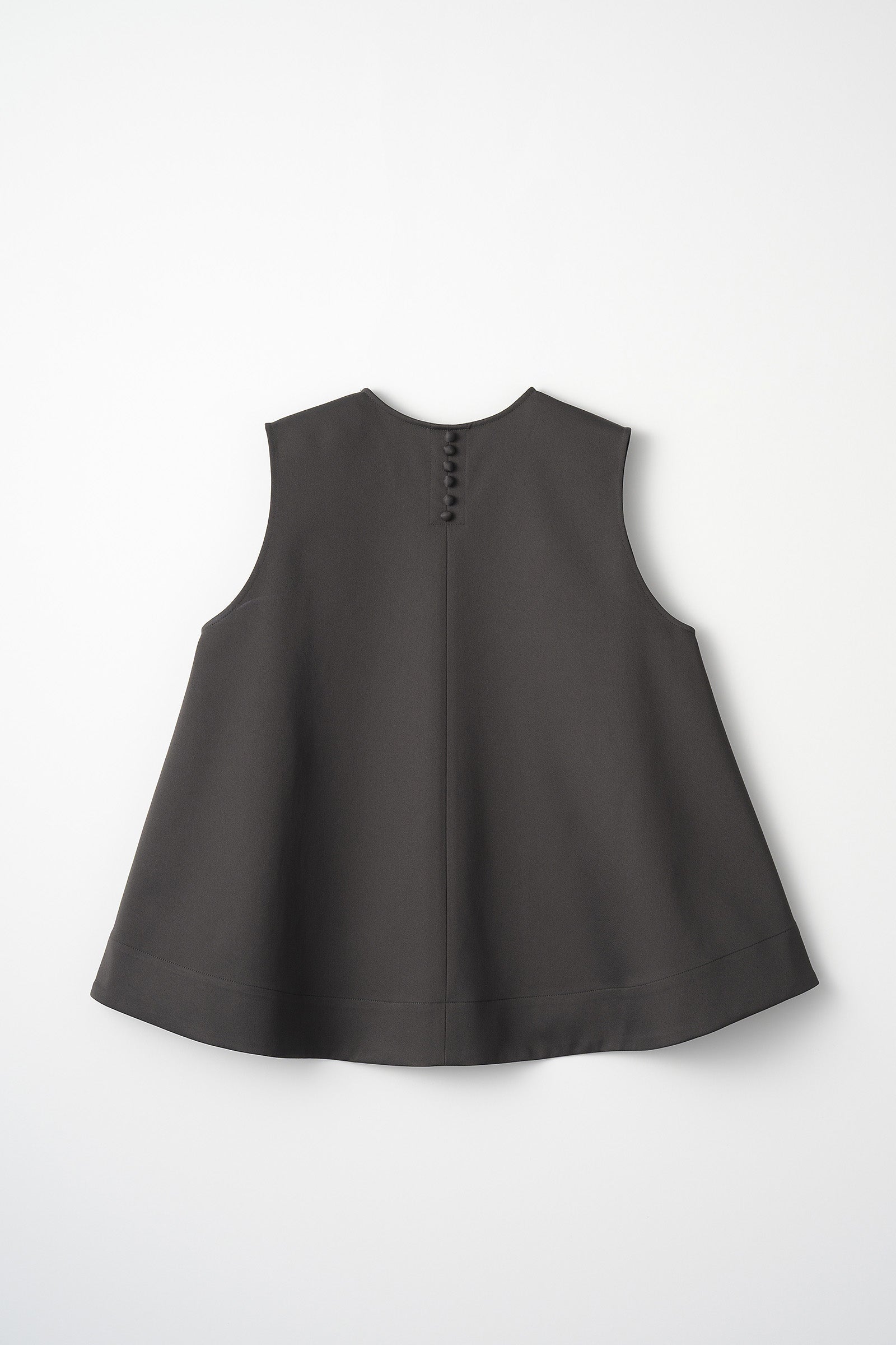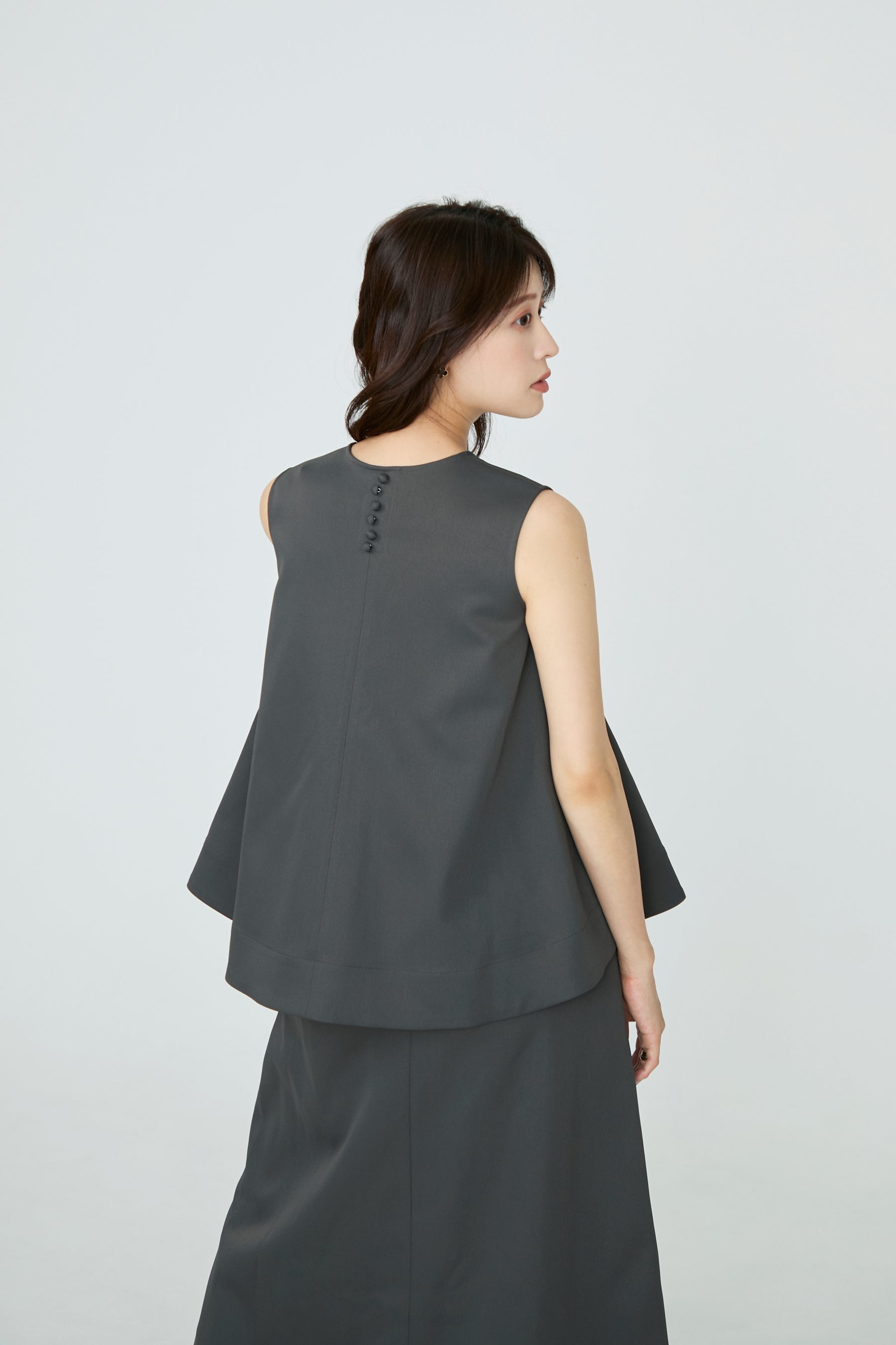 胸元から立体的に広がるフレアシルエットが印象的なノースリーブトップス。