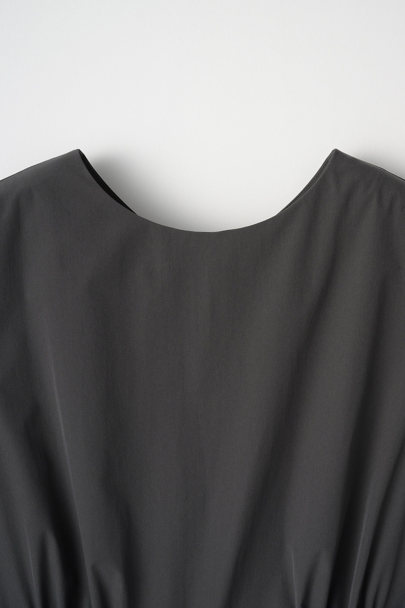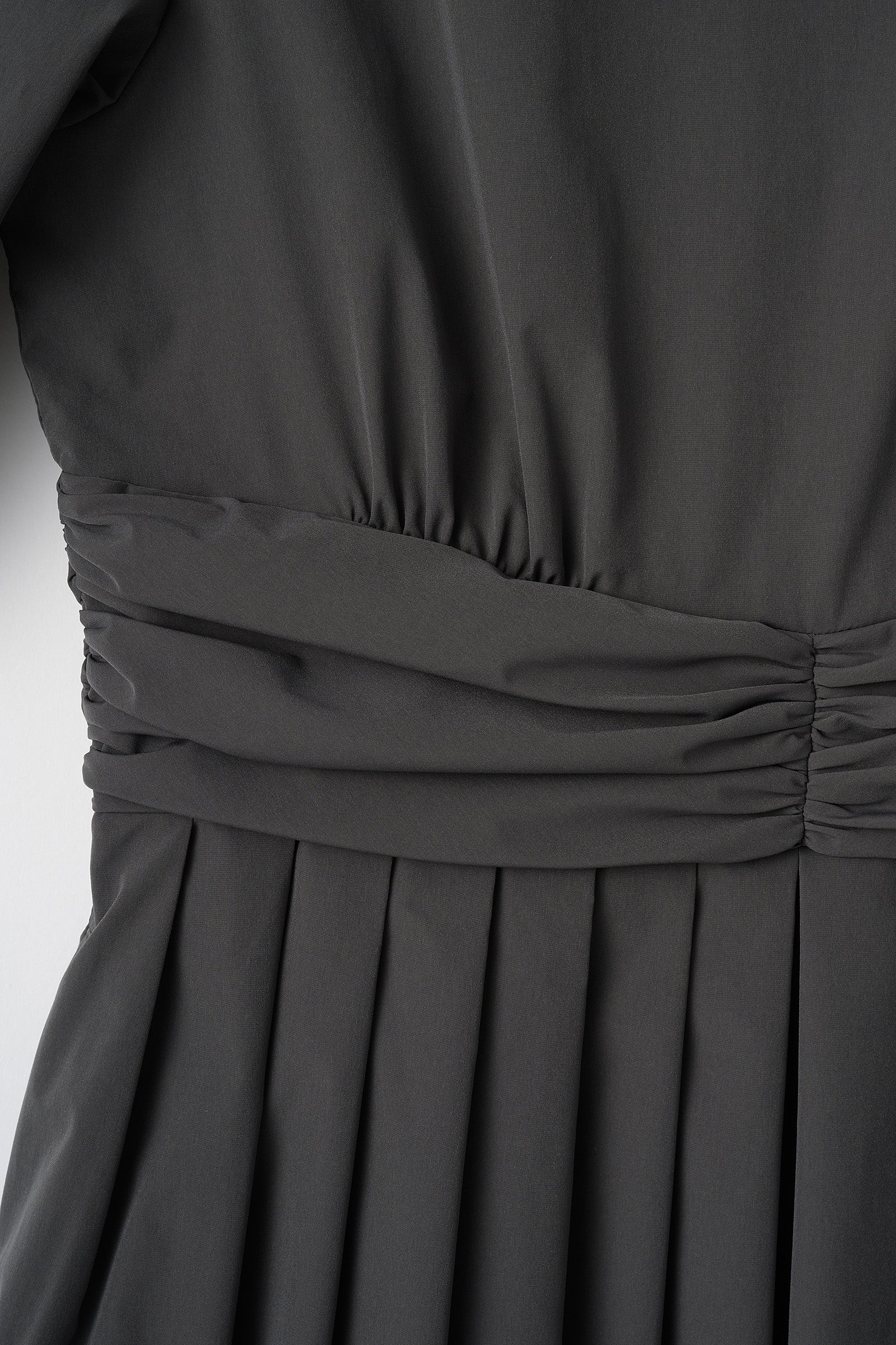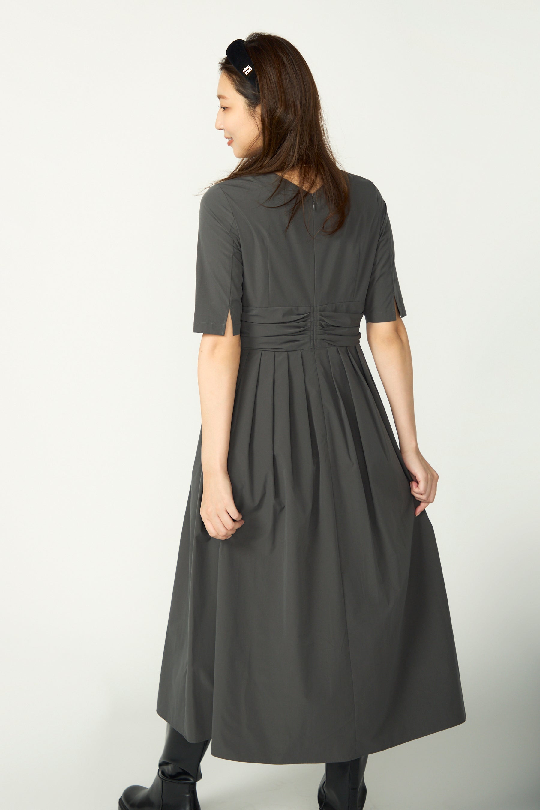 ウエストまわりに複数のタックを重ね、ギャザーのような立体感を演出したミディ丈ワンピース。