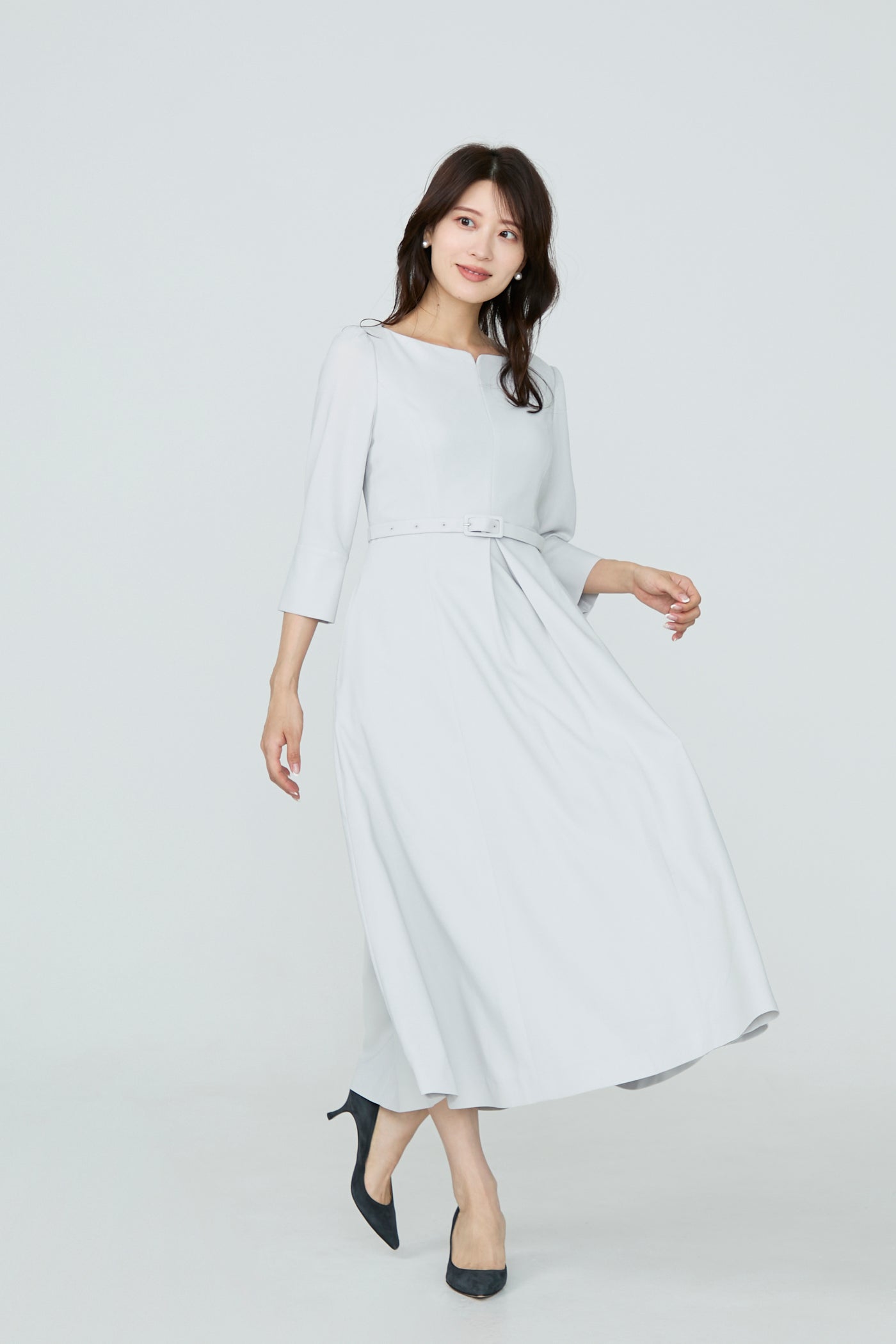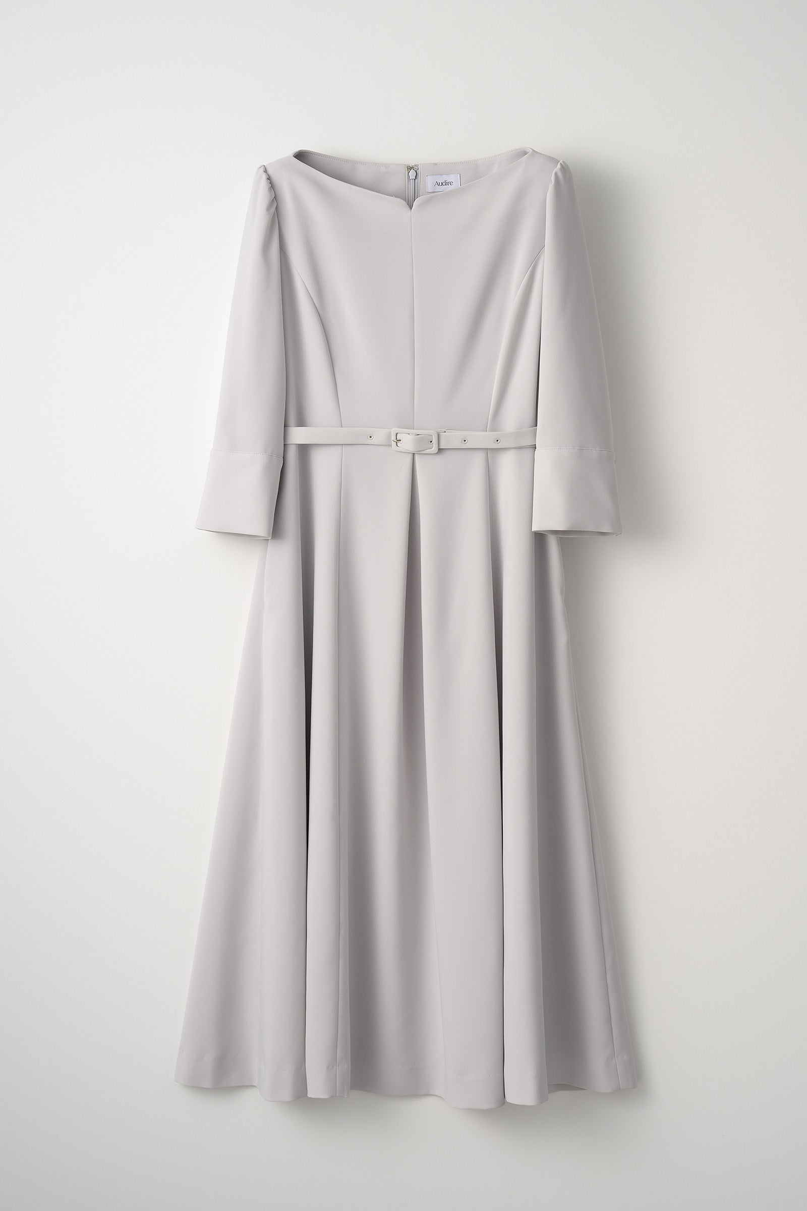鎖骨に沿ったボートネックがすっきりとした印象のドレス。