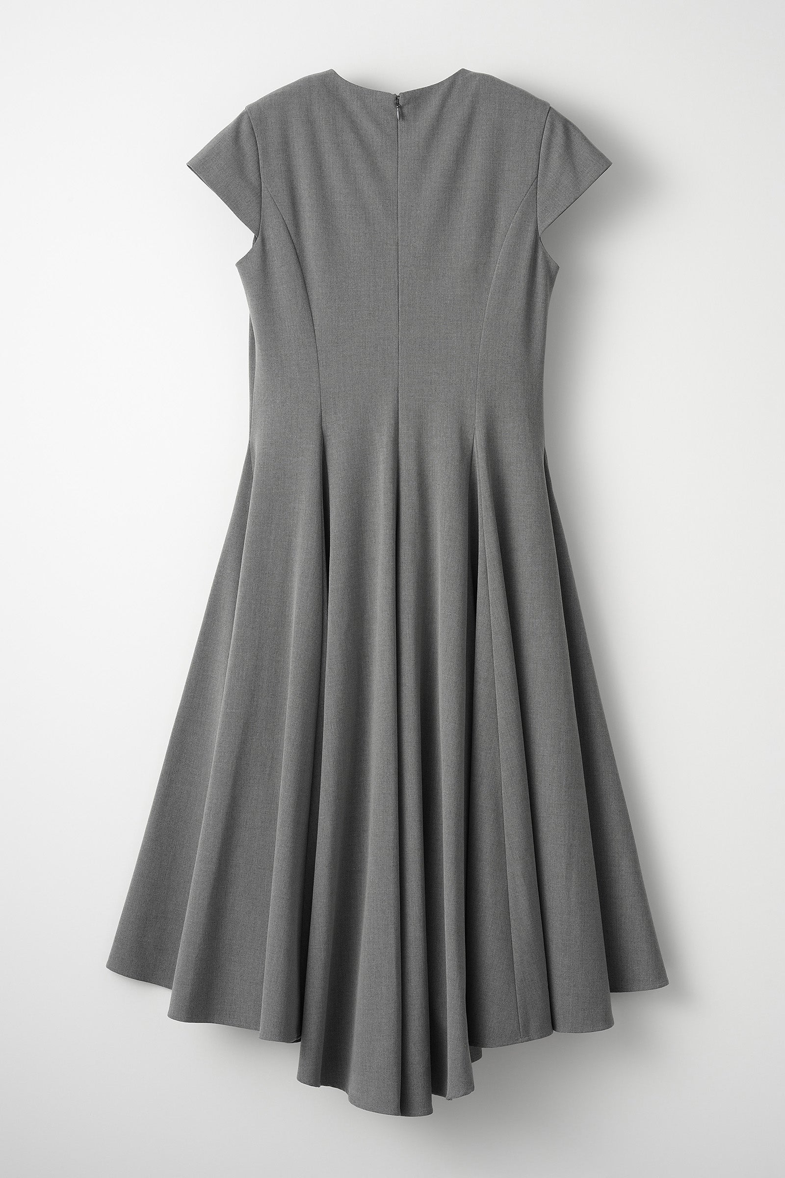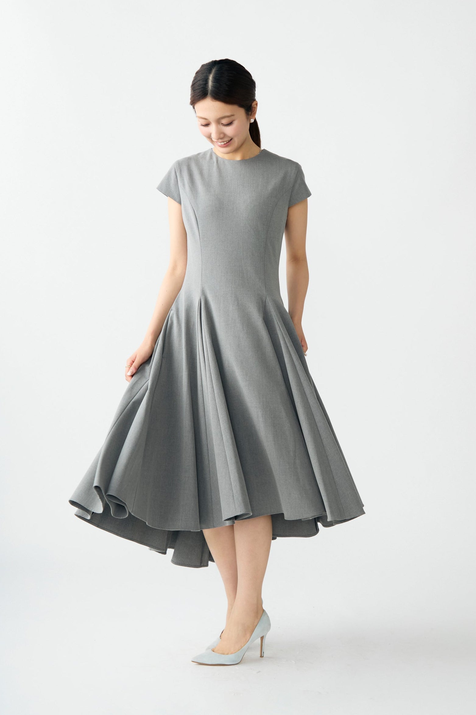 すっきりとしたウエストラインから広がるフレアシルエットが、身体のラインを美しく見せてくれる一着。