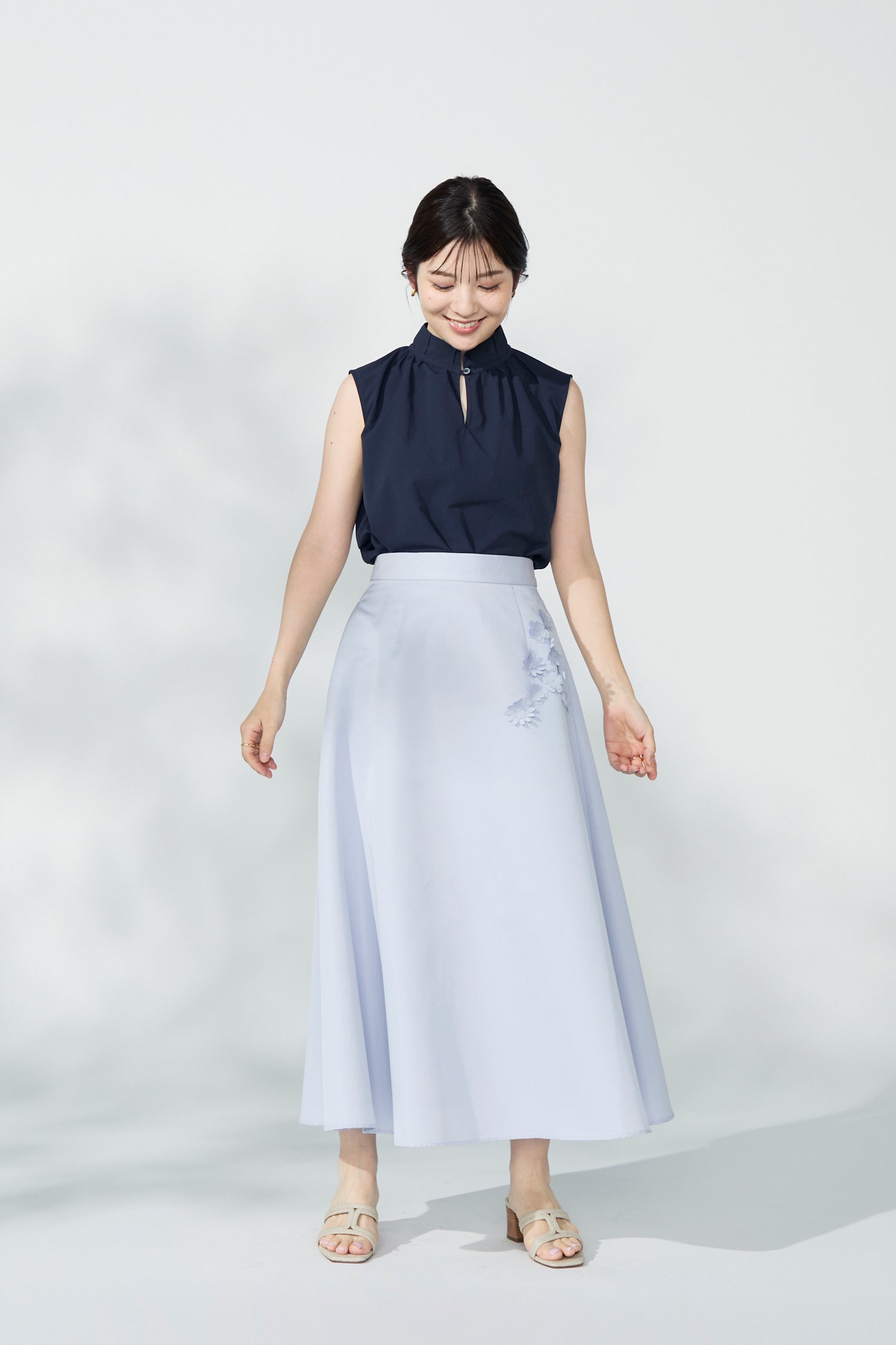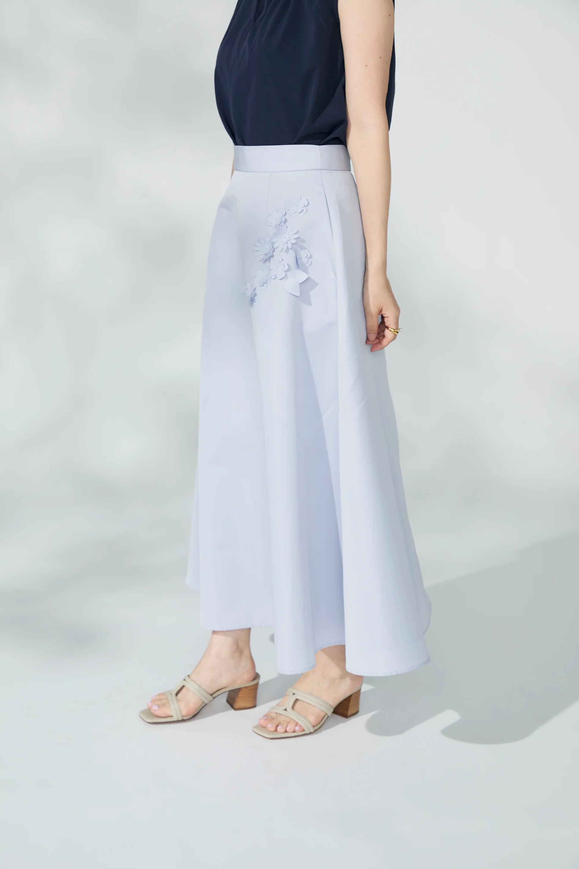 2ndのGrosgrain circular skirtに同素材の花のモチーフをあしらい華やかさをプラスしたスカート。