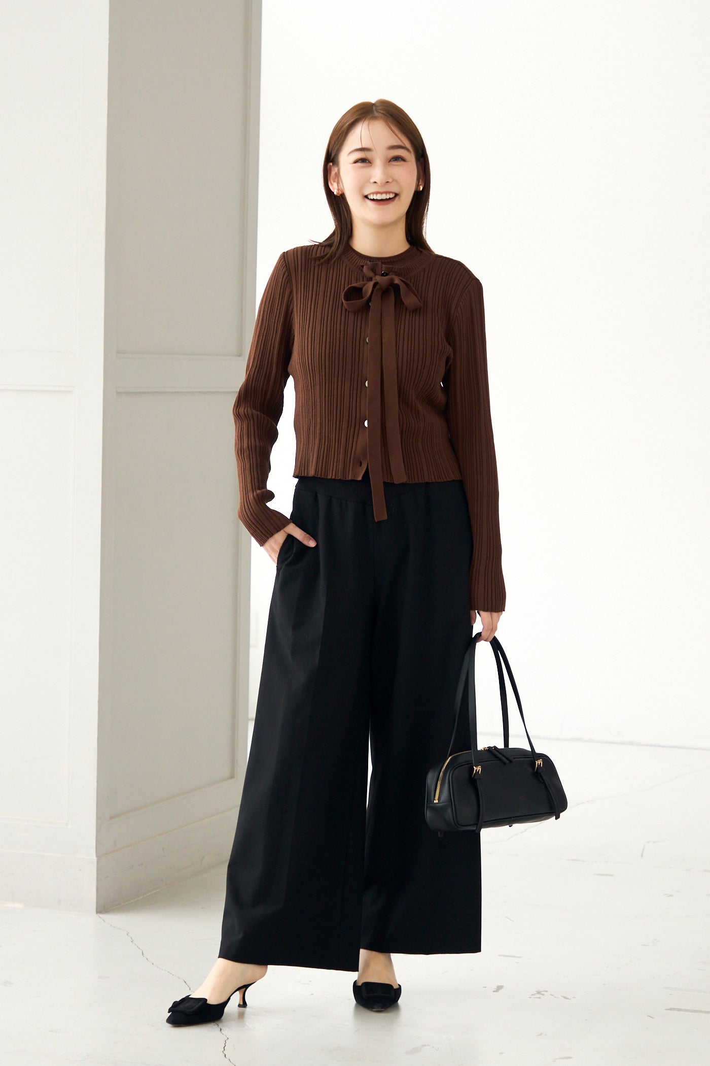 カーディガンのリボンは襟元のボタンホールに通してボウタイやリボンのように結べます。