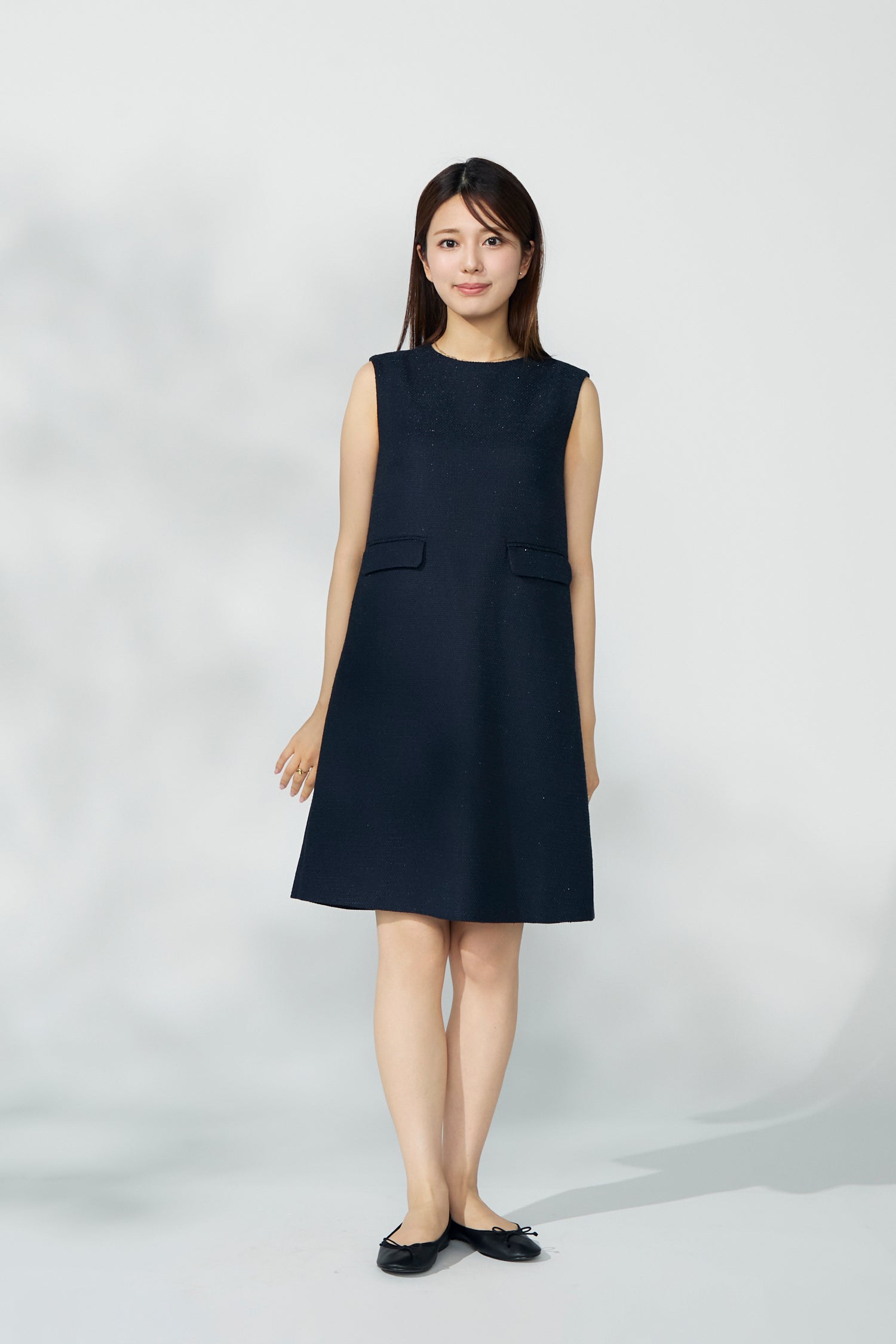 ツイード素材を使用した、ノースリーブでラウンドネックのシンプルなデザイン。