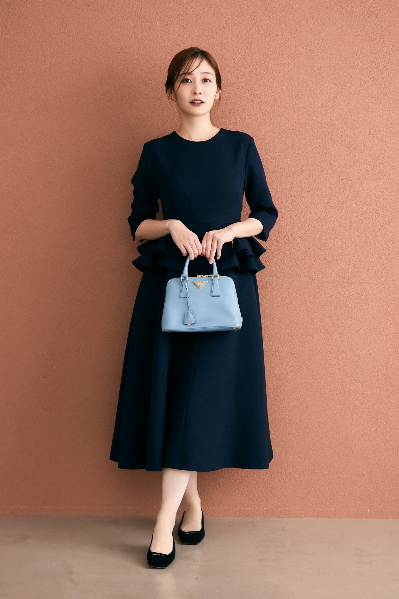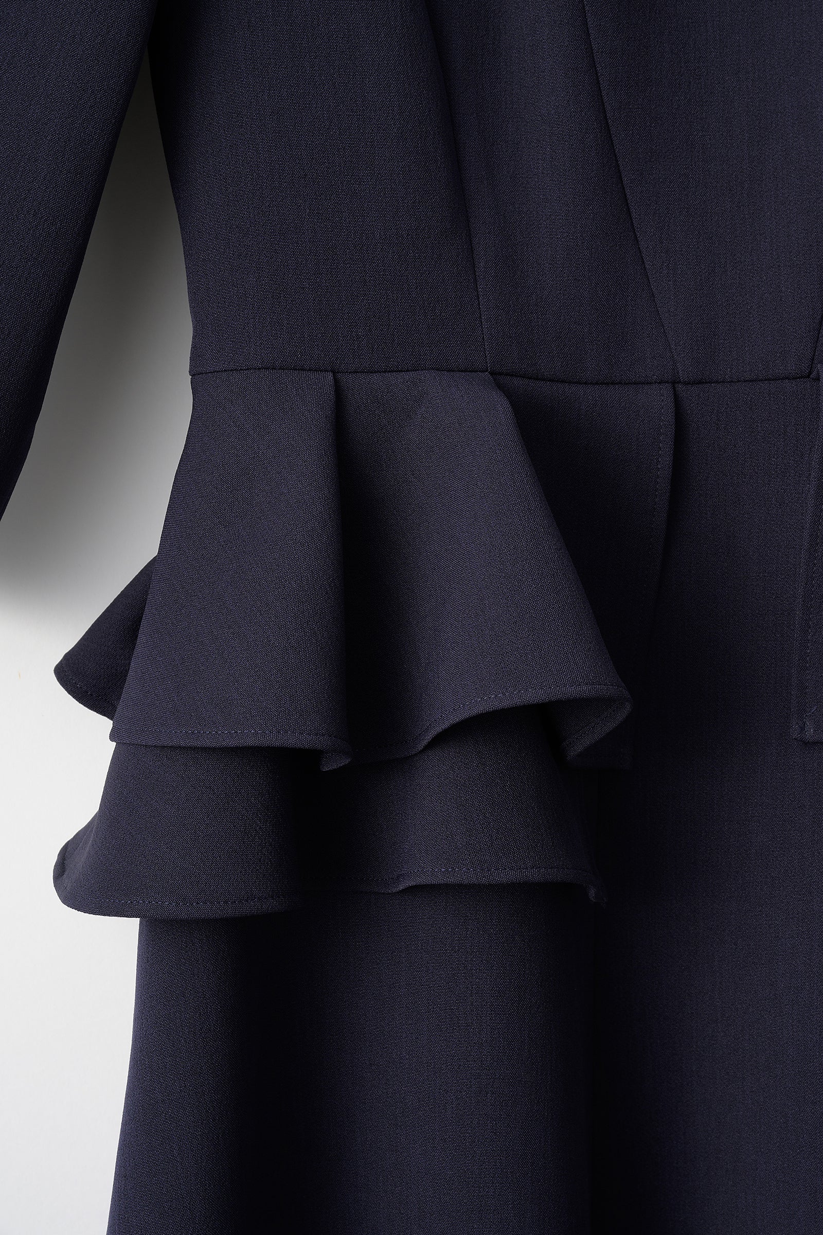 二段に重ねたペプラムデザインが特徴的なドレス。