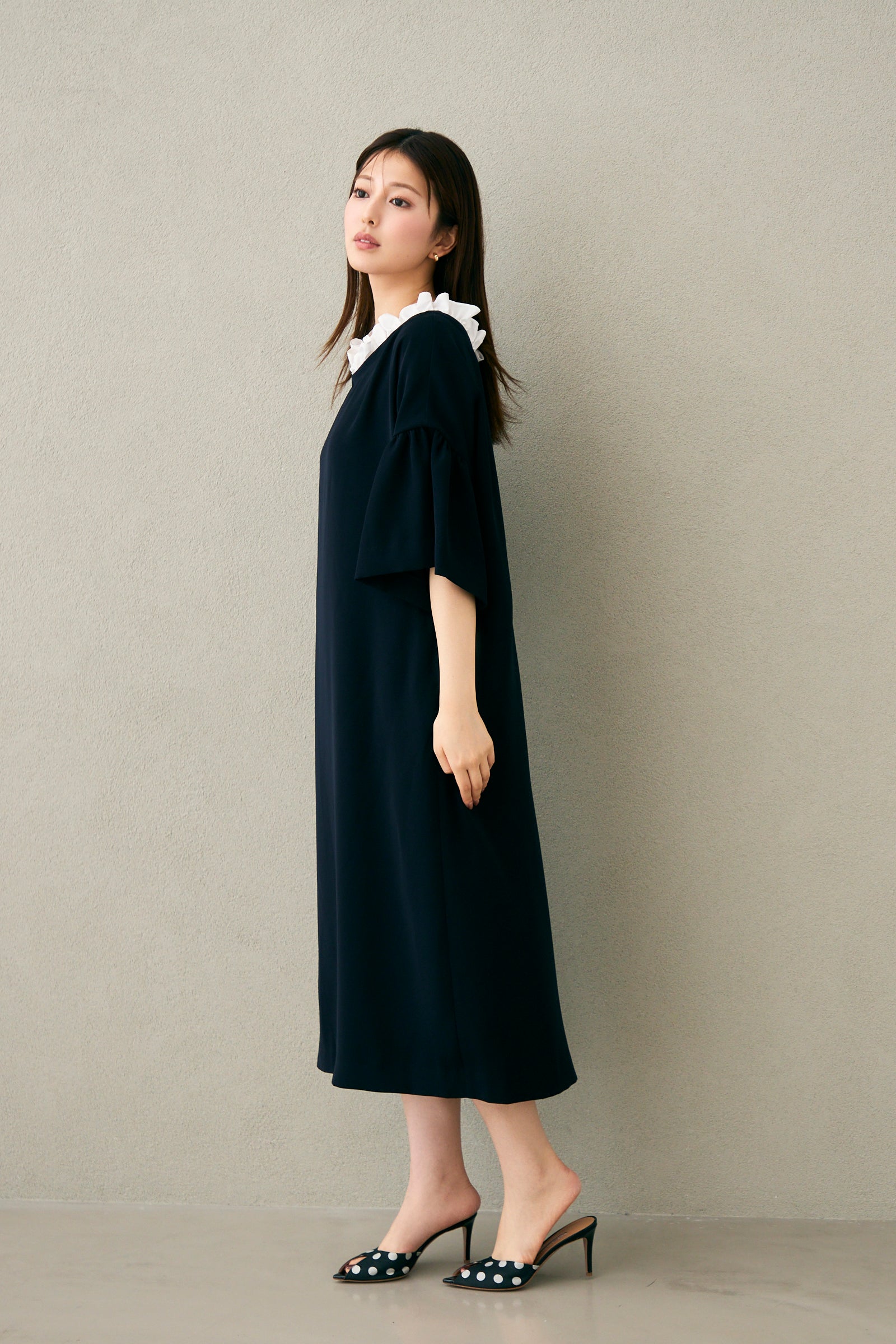 ボートネックにフリルをあしらったワンピース。