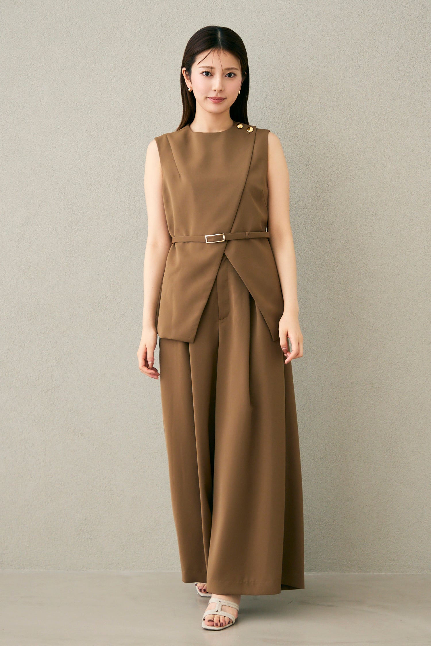 裾までまっすぐ落ちるワイドシルエットで、脚まわりに十分なゆとりがあります。