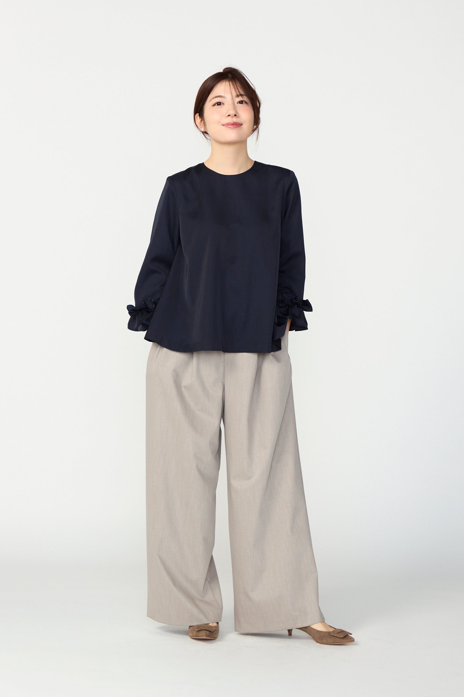 ※ネイビーのみ生地が異なり、ストレッチ性のある素材となり、ベージュ/グレーは適度なハリを感じるしなやかな素材です。