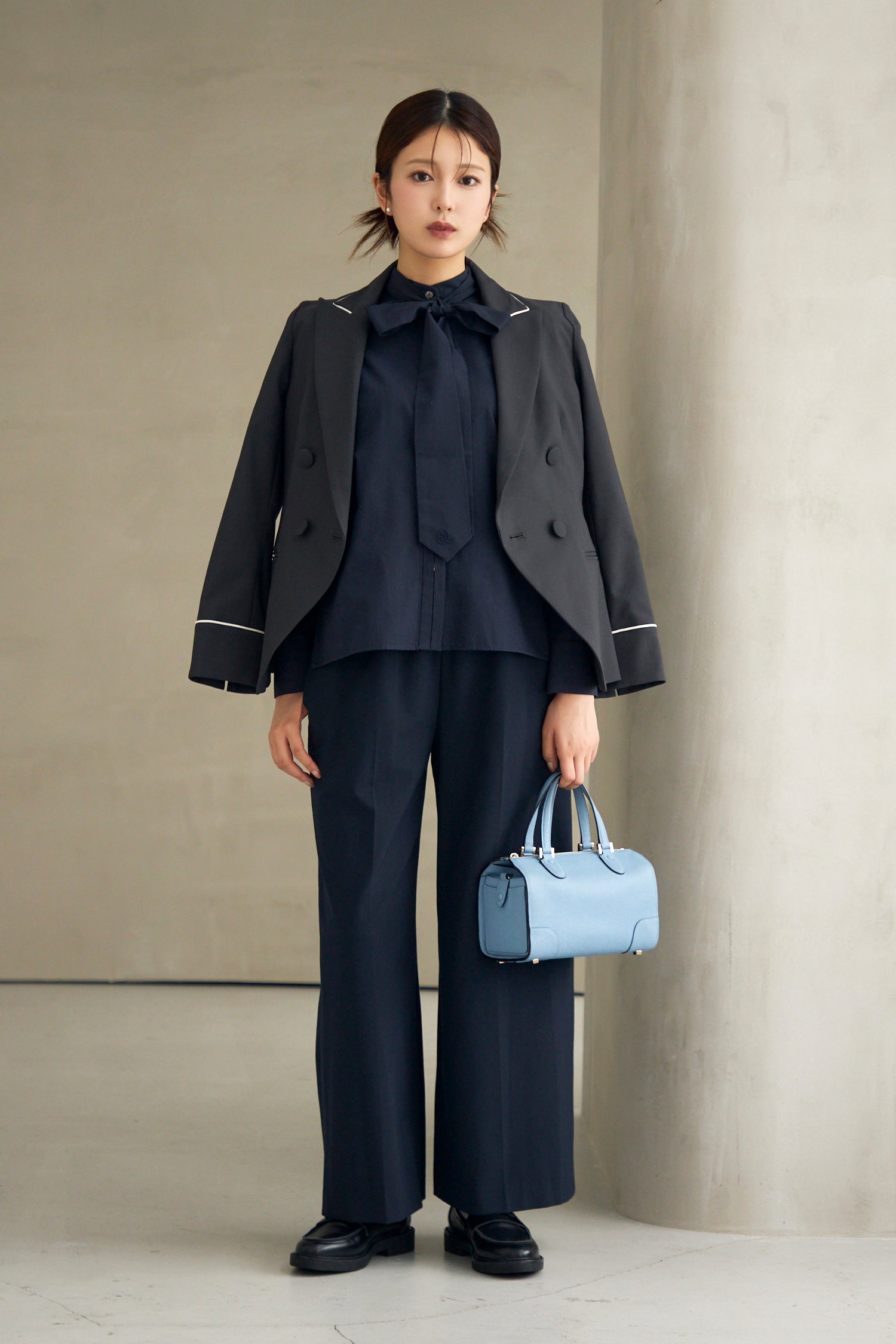 襟元にループがあり、付属の太・細タイのほか、お気に入りのスカーフなども巻けるようにしています。
